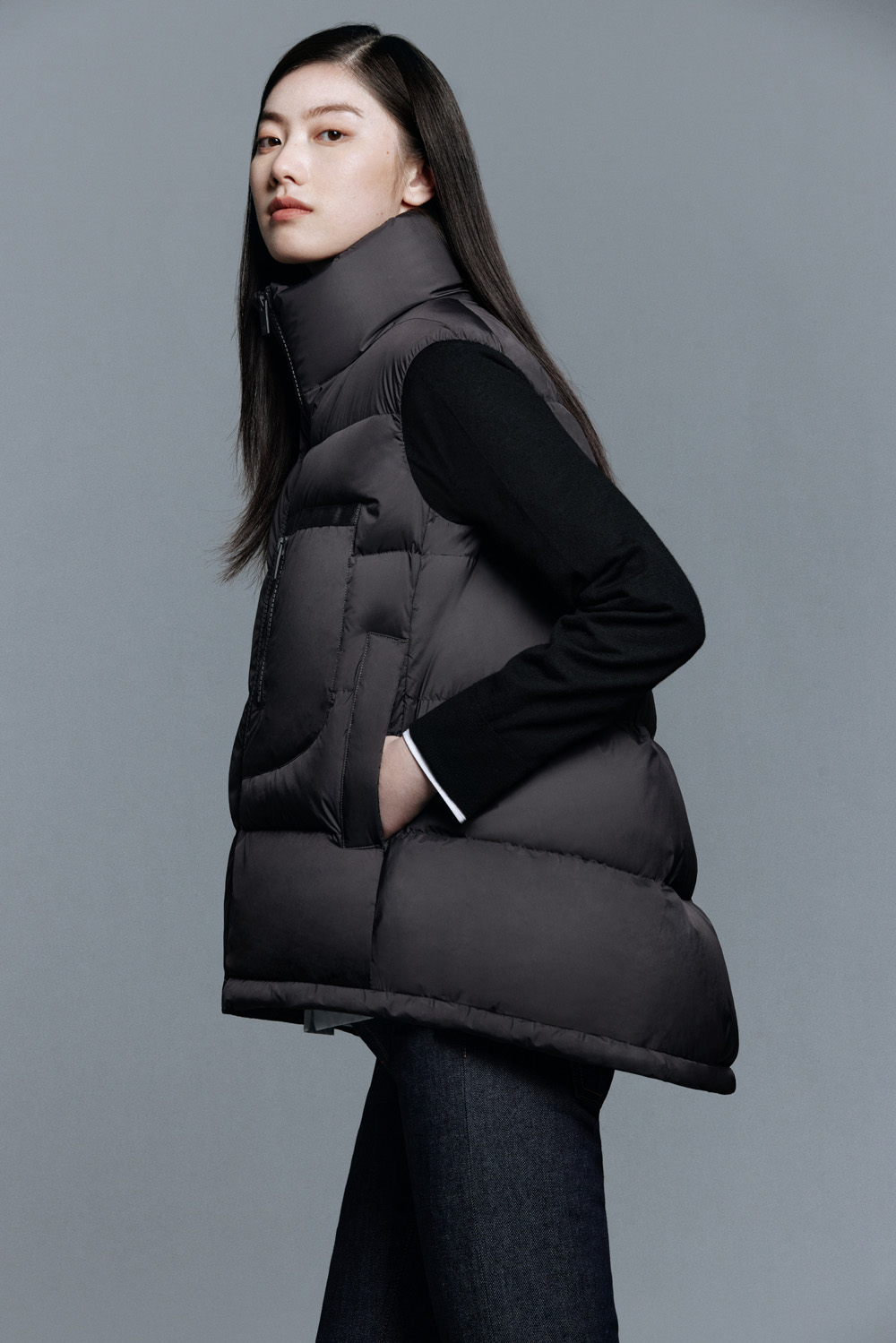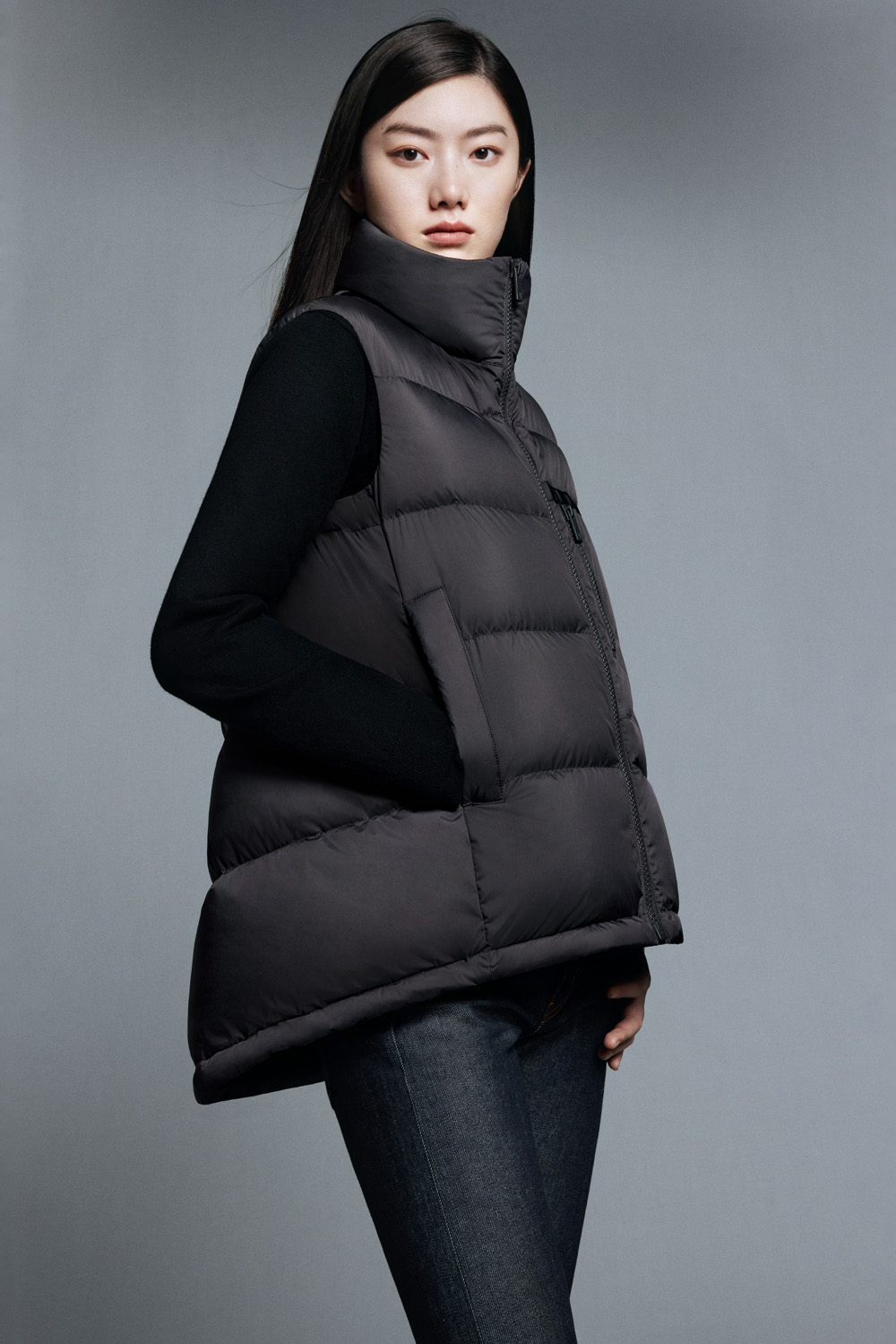 本季超 A 弧形羽绒背心也非常值得一看。全新推出的背心款,采用首创的 A 字形建筑感廓形,前段后长的不对称弧形下摆,上身效果十分惊喜。秋冬想要在街头脱颖而出女生,这一件不能错过。