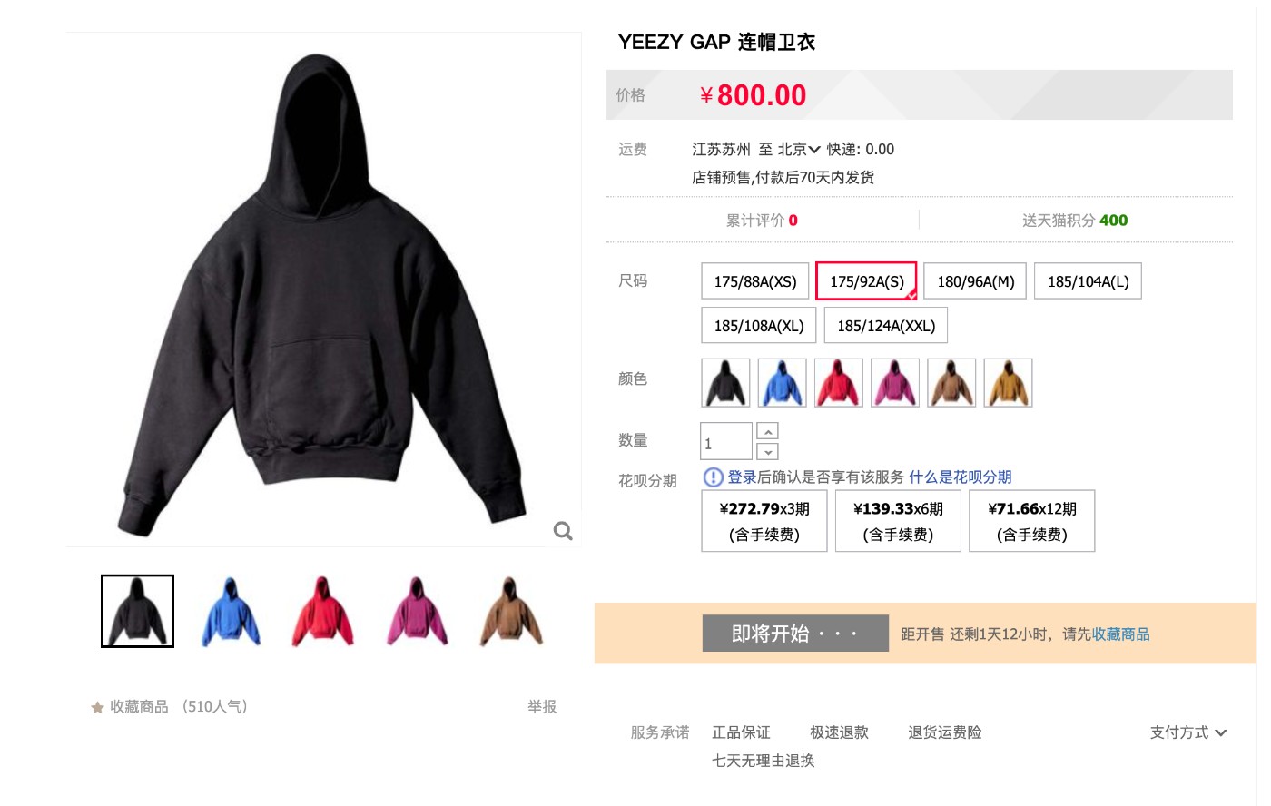 今天 GAP 天猫官方旗舰终于上架了 YEEZY x GAP 系列的第二款单品:连帽卫衣,这也是 YEEZY GAP 首款卫衣亚洲首发。