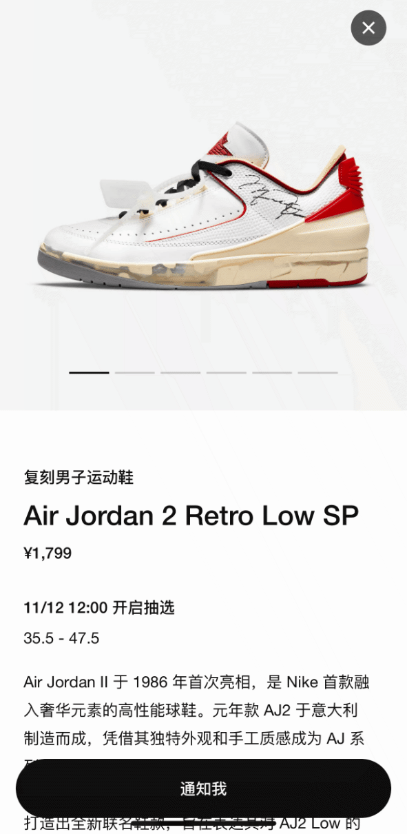 两款 OFF-WHITE x Air Jordan 2 Low 现已在 SNKRS 上架,将于 11 月 12 日中午 12 点开启抽签,发售价格为 ¥1799 元。