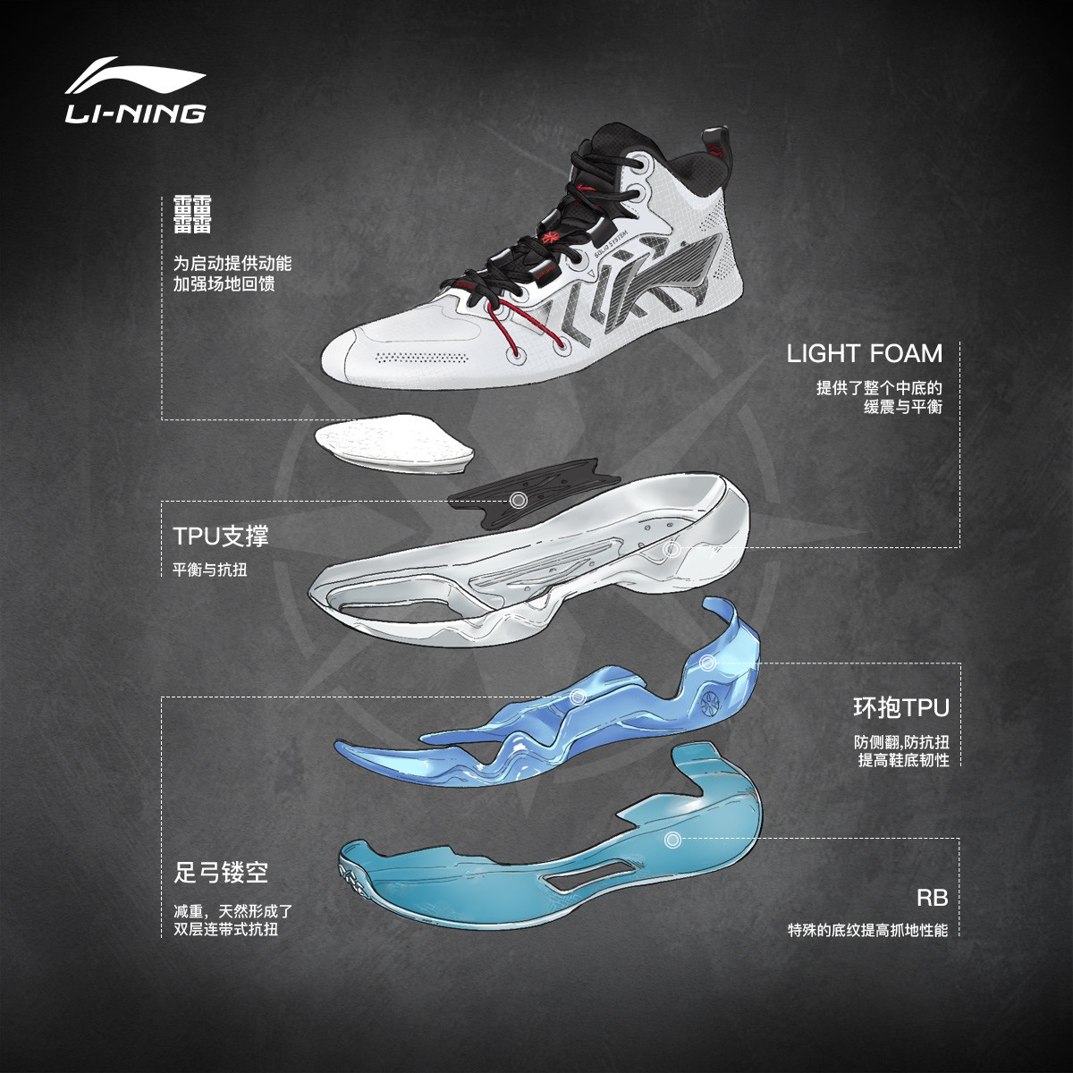 中底则延续了李宁多款战靴的设计精髓。
