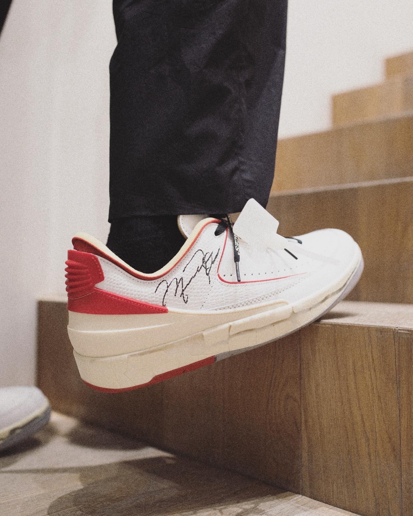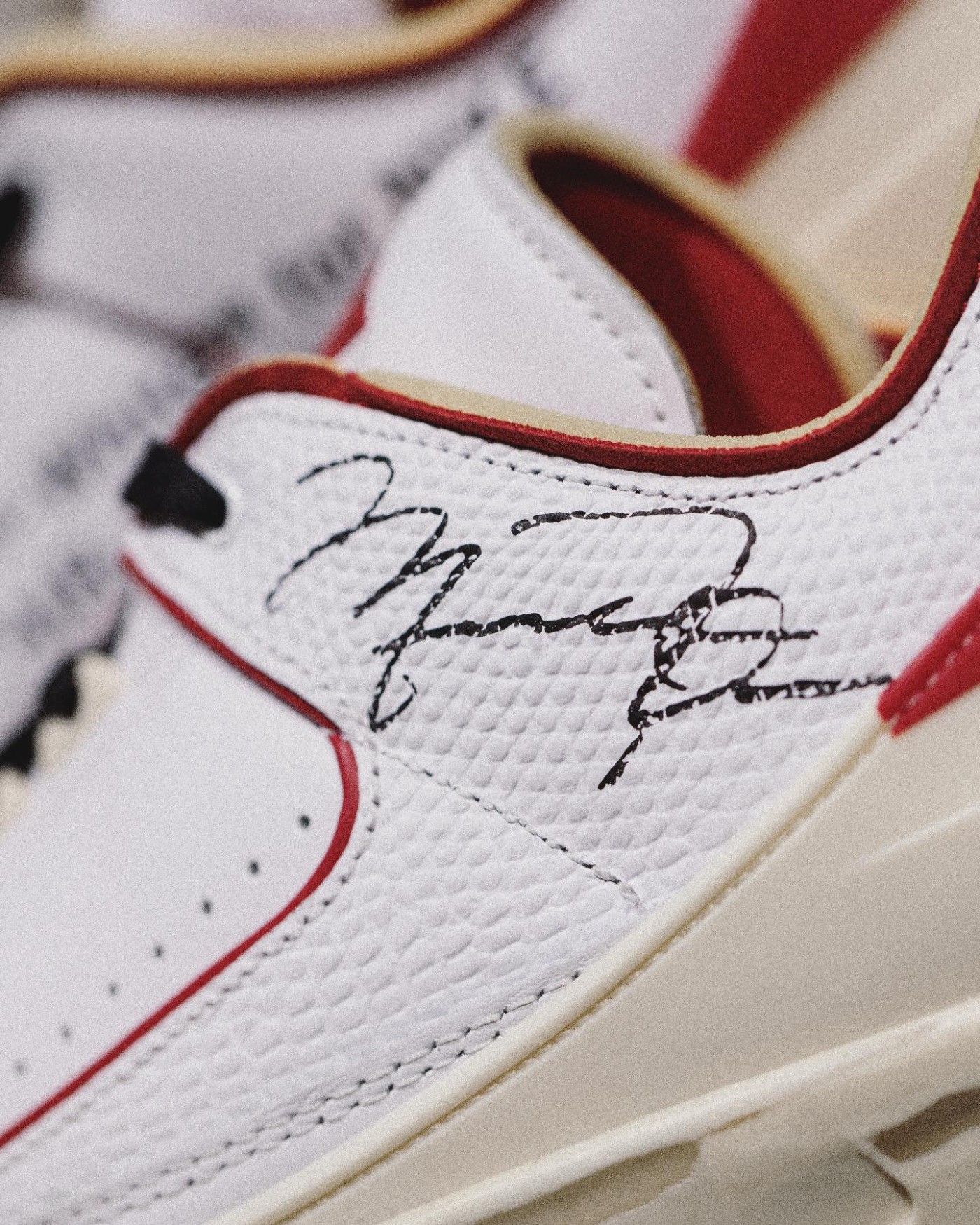 为了将早年的 Air Jordan 2 原汁原味还原而出,设计团队还三维扫描了一双乔丹亲穿亲签的元年白红 Air Jordan 2。