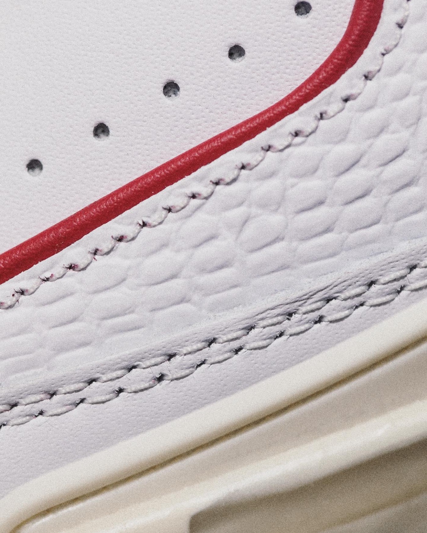 中底上不规则的裂纹和裂缝都真实还原了元年 Air Jordan 2 破损的中底,白红配色还将中底改为乳白色,自带氧化做旧效果。