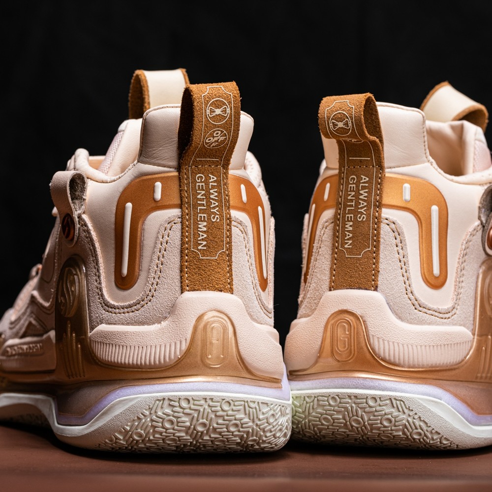 后跟提环同样为翻毛皮材质,上方印有与鞋舌提环相同的图案以及字样,左、右后跟的 A、G 组合在一起便是阿隆·戈登的英文缩写。