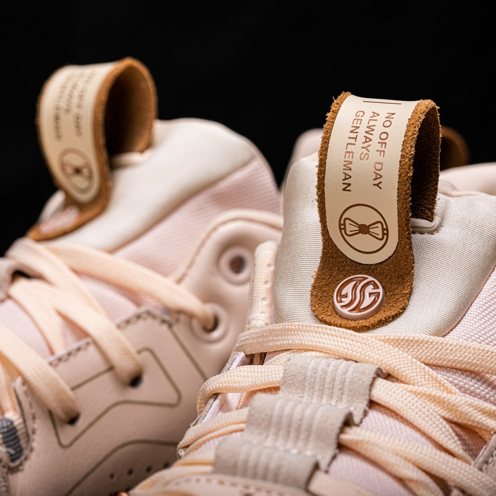 棕色翻毛皮打造的鞋舌提环上,印有 “始终保持绅士” 的英文字样,并搭配西装领口的蝴蝶结图案,彰显配色身份。