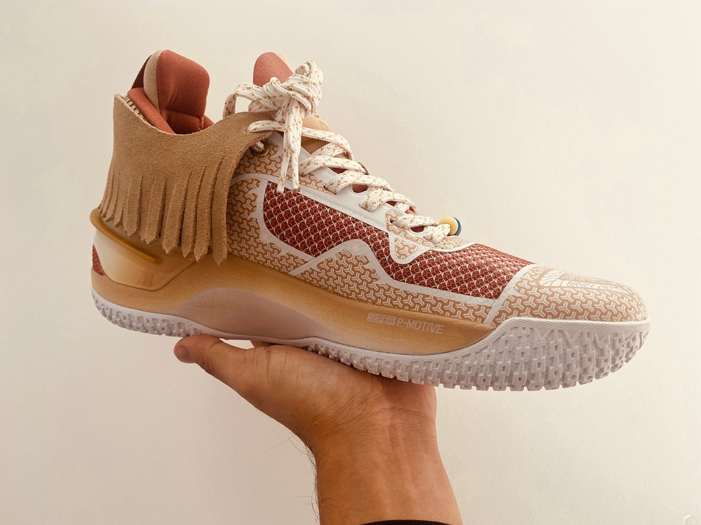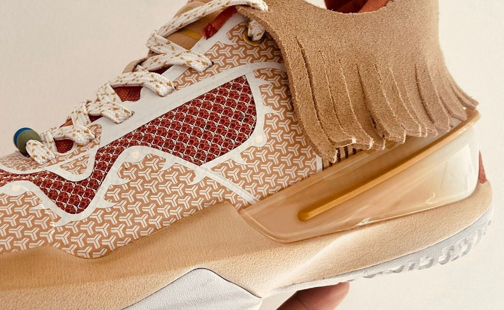 另外一大亮点就是后跟包裹的流苏麂皮装饰,可以理解为齐天大圣的虎皮裙,也可以理解为猴子的皮肤与毛发,鞋舌末端还点缀三颗彩珠。