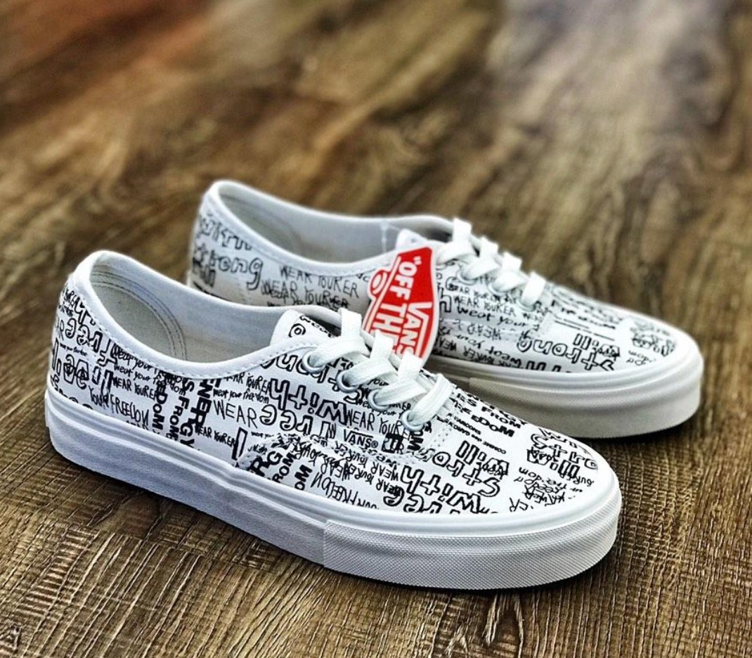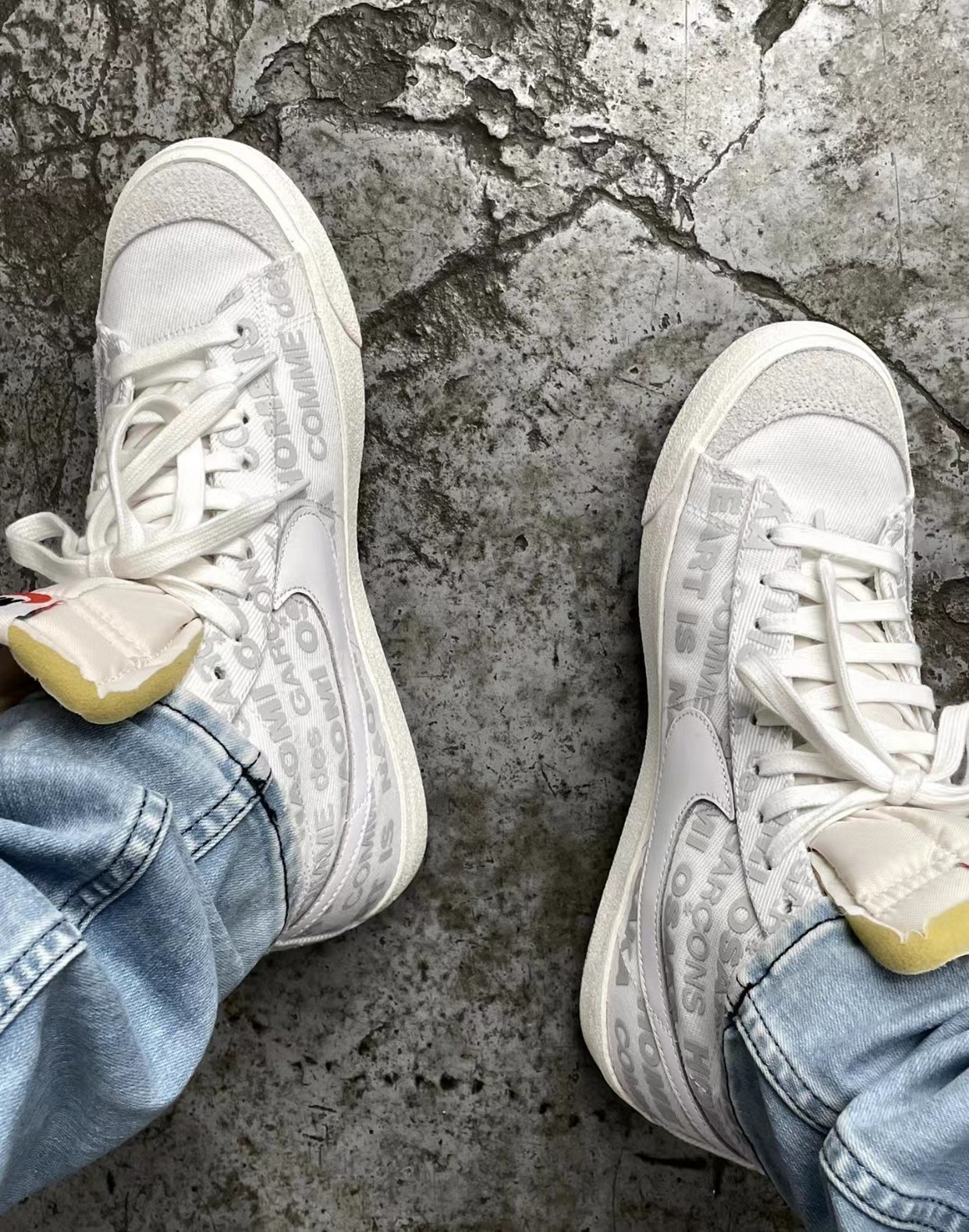 不同于此前的 CDG 满印效果,鞋面覆盖黑色涂鸦字体,白底黑字的超高反差,视觉效果同样醒目。