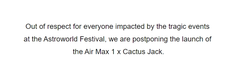 由于 Astroworld 演唱会的悲惨事件,决定推迟 Travis Scott x Nike Air Max 1 的发售计划。