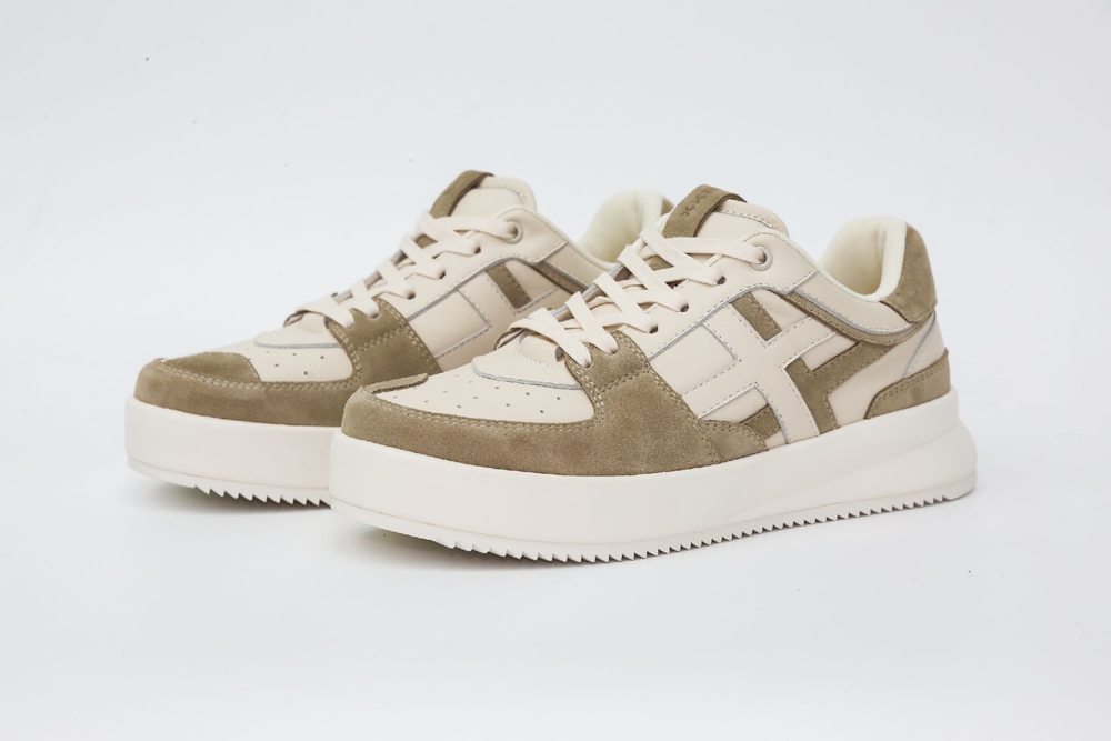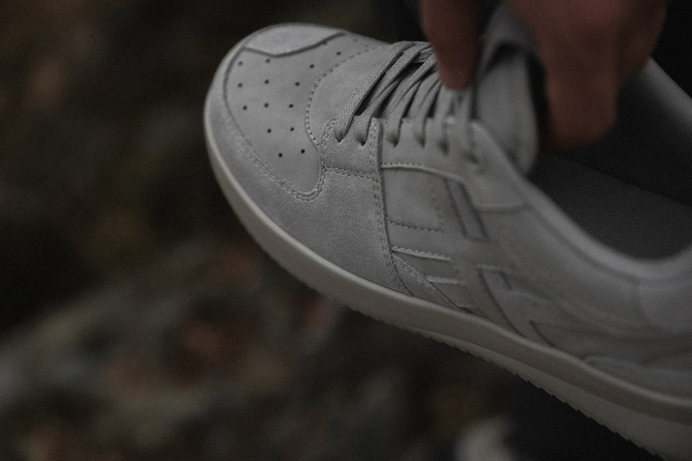 鞋款整体以复古休闲风格为主,运用多种材质拼接组成。