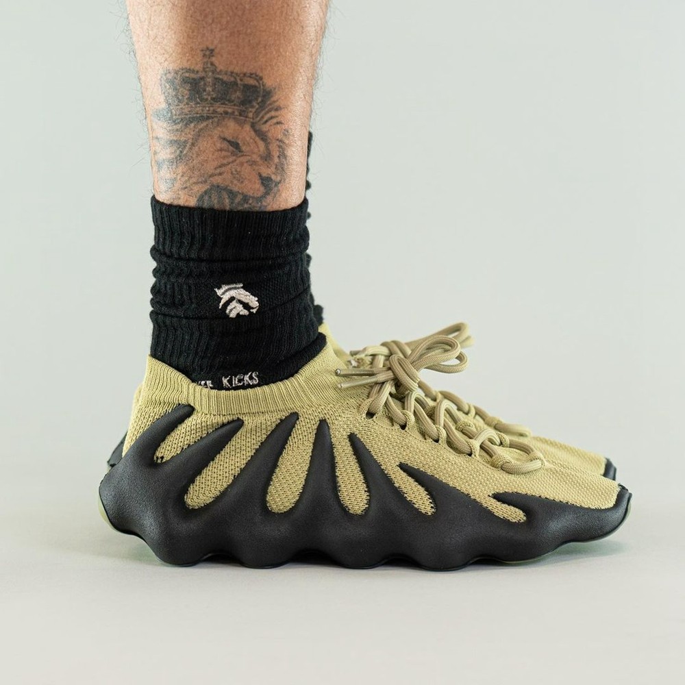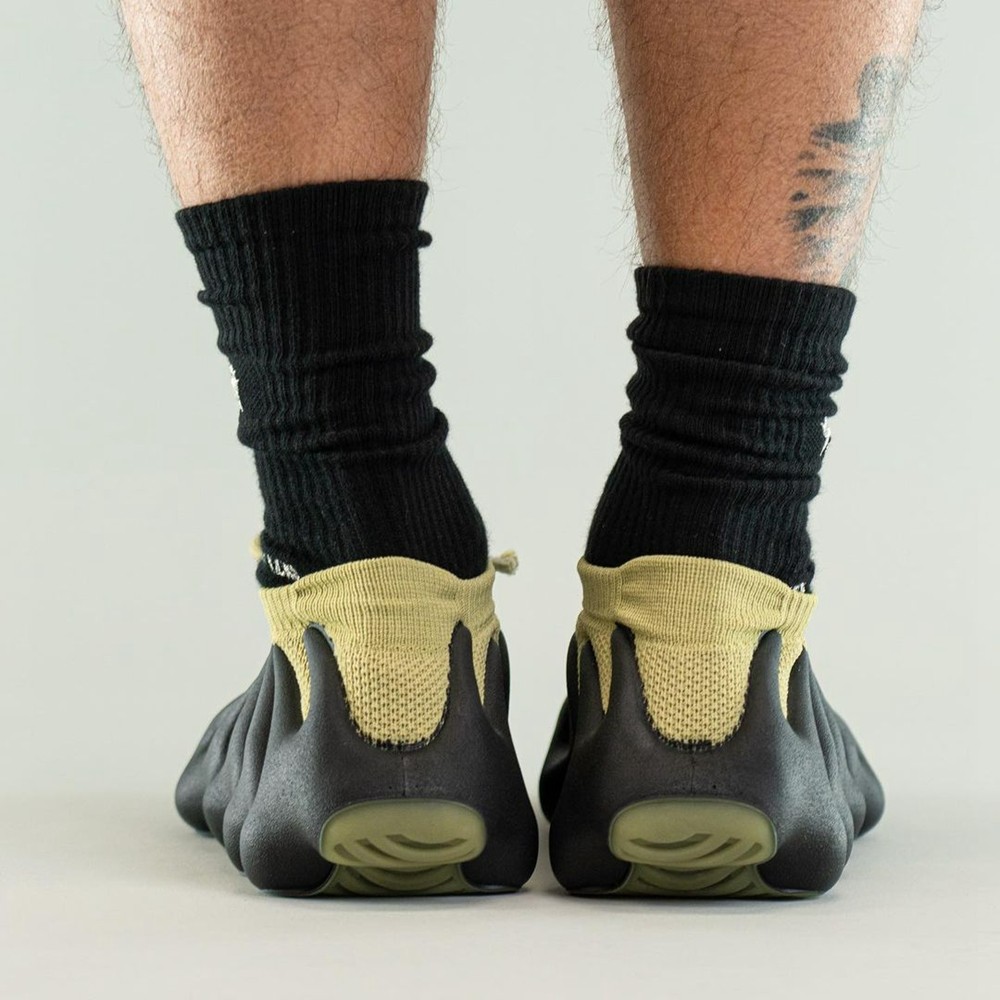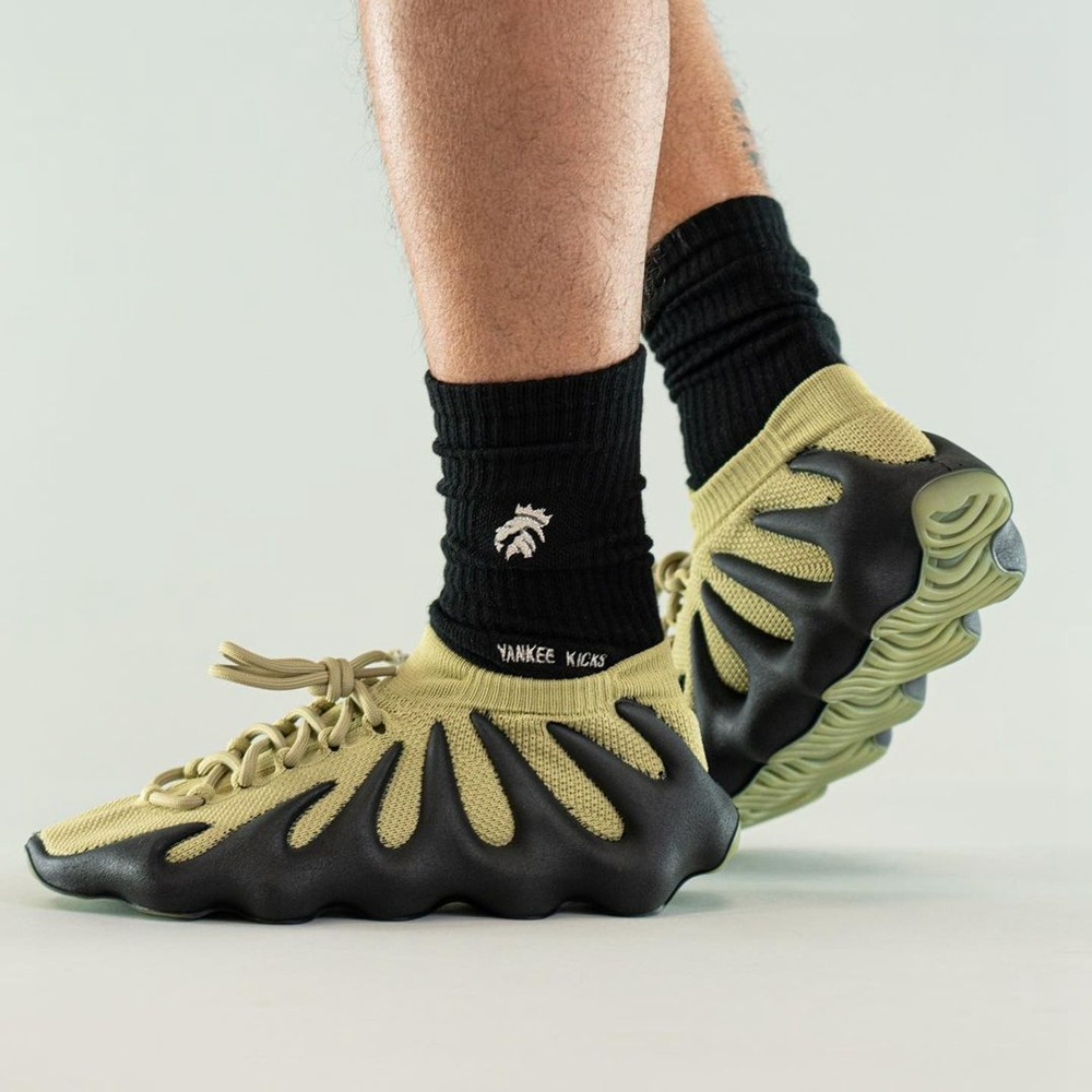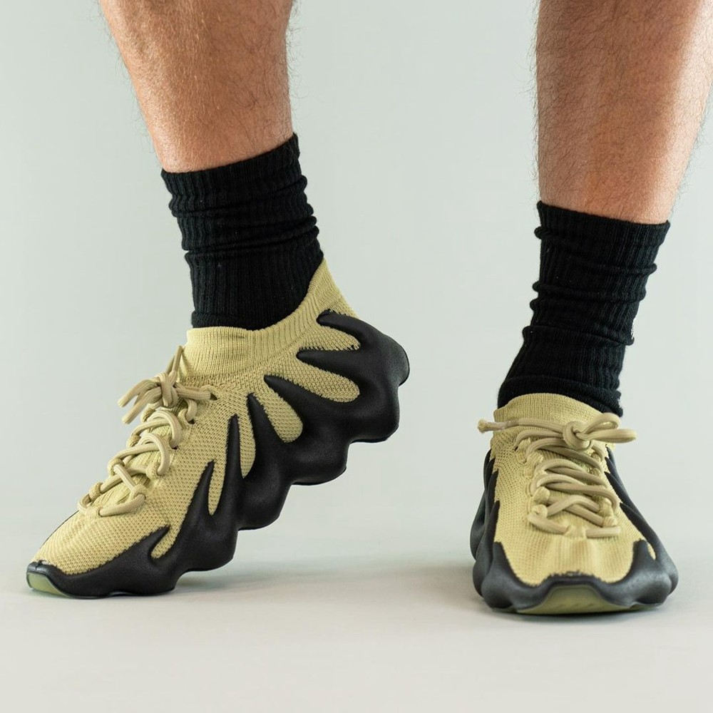 颜色方面选用 Yeezy 系列中罕见的芥末色和黑色的配色,搭配在一起确实违和感较强。