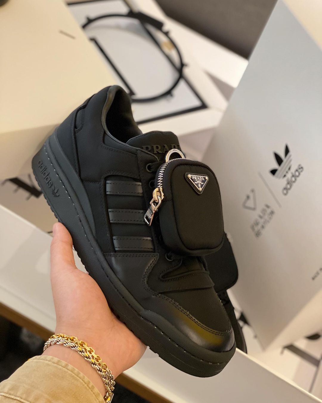 此前 Prada x adidas 联名系列鞋、包分别发售的形式,此次的 Prada x adidas 真称得上 “买鞋送包” 了!