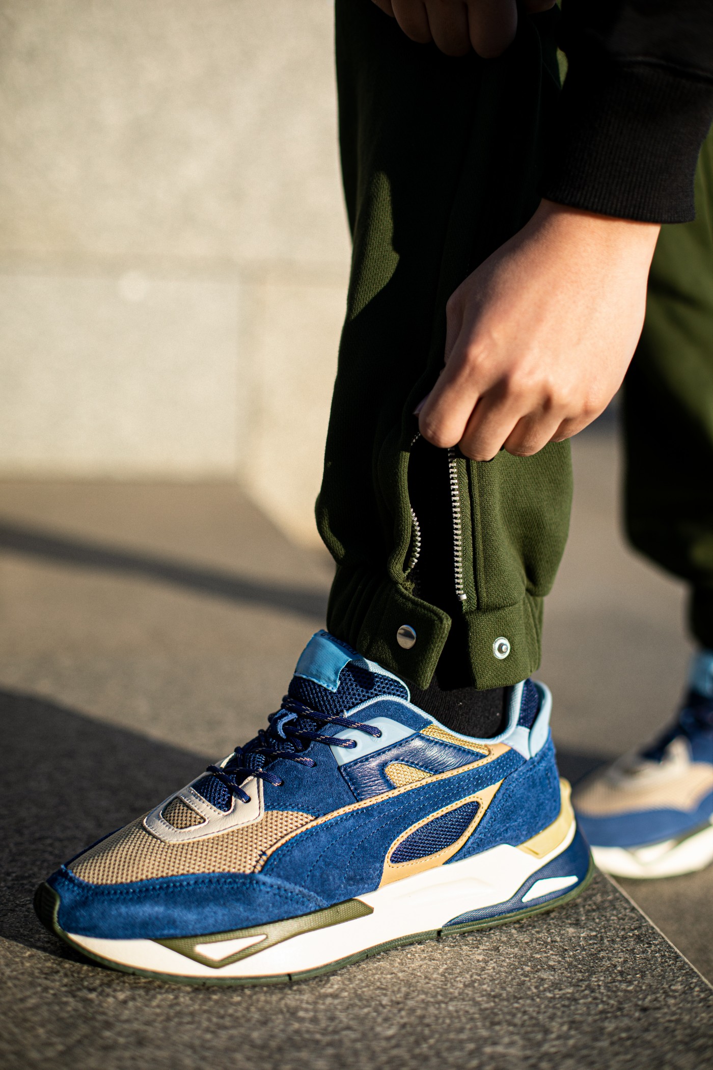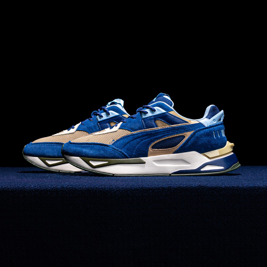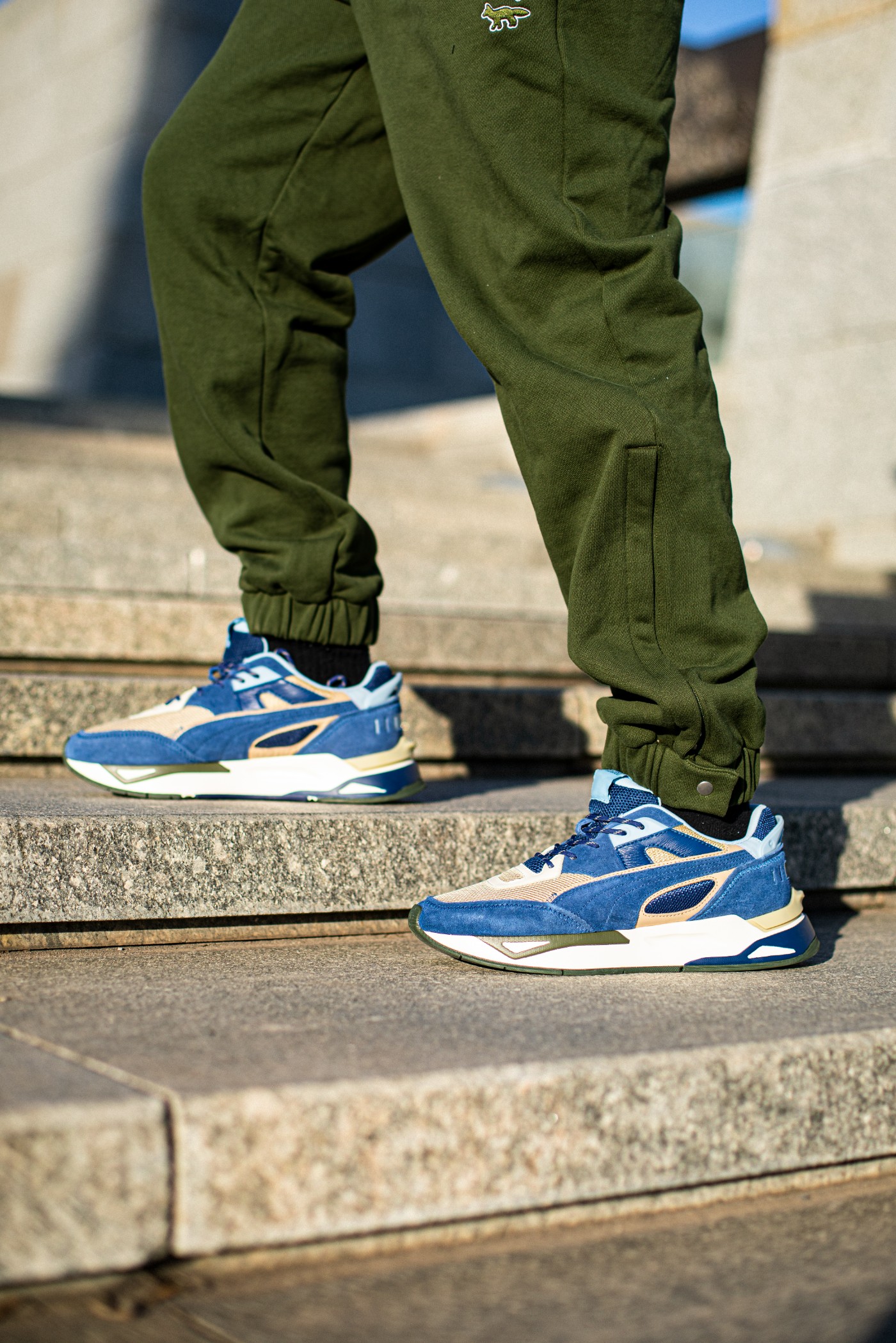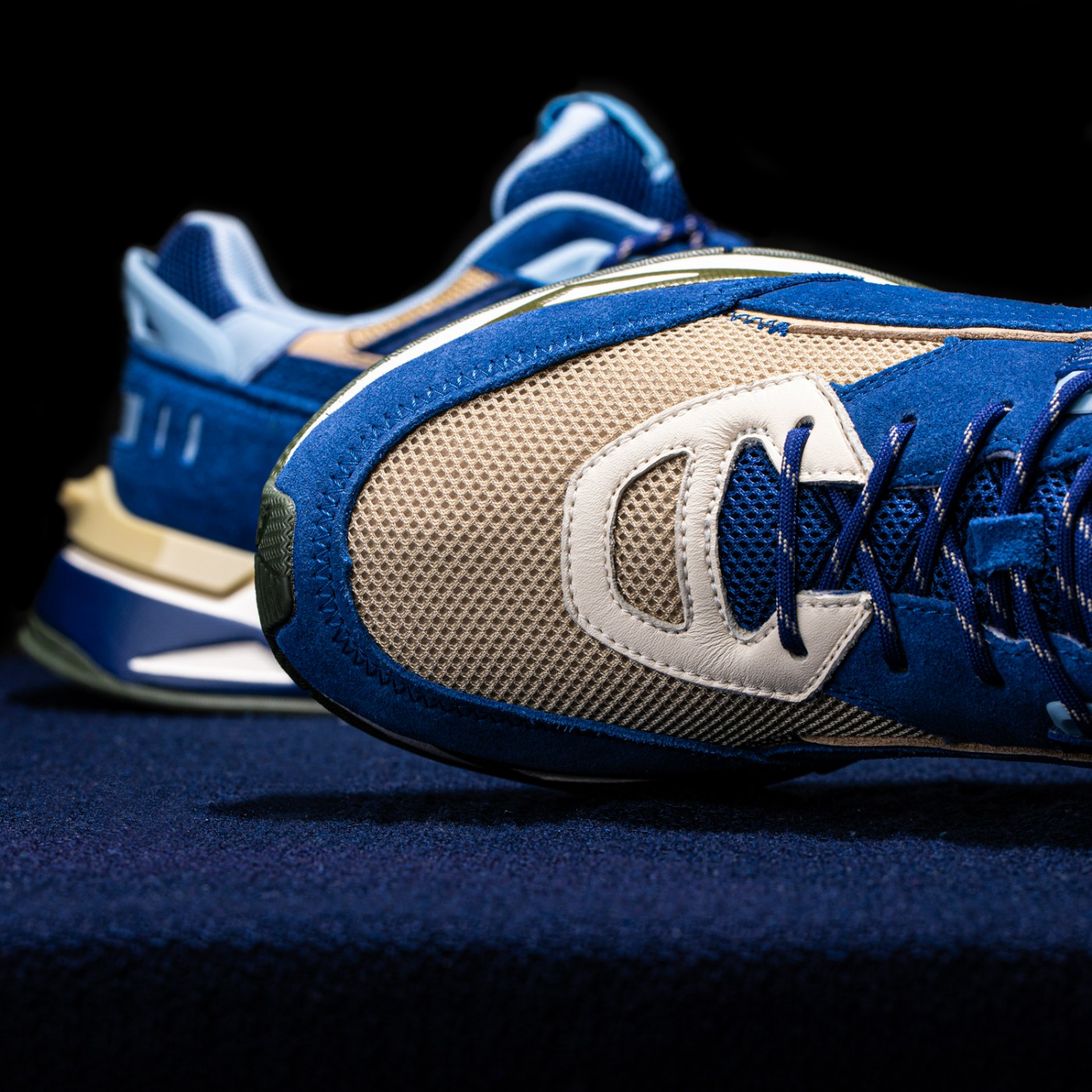 鞋面以不同色调的蓝色、卡其色撞色拼接打造,营造出丰富的层次感。