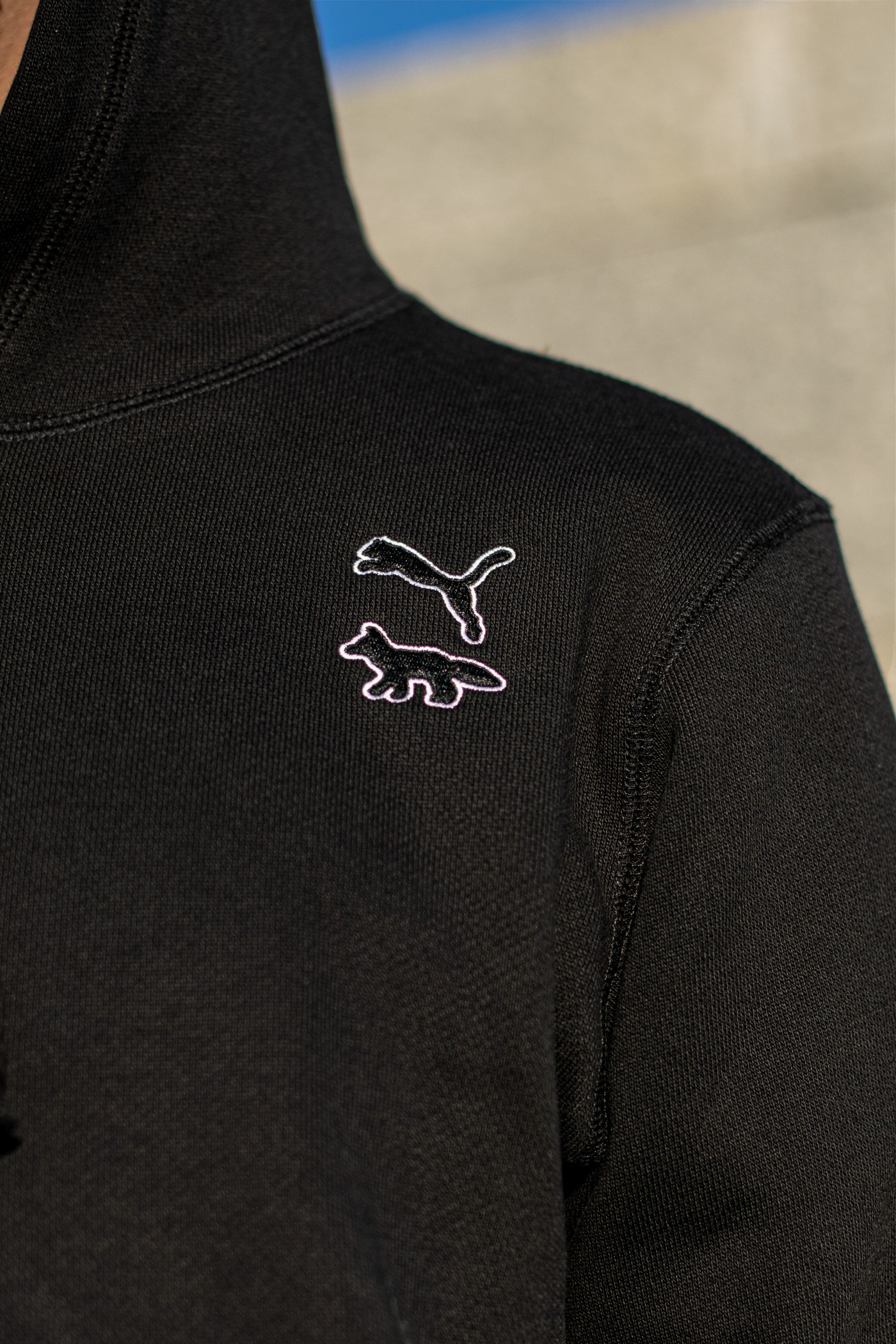 黑色帽衫左肩绣有小狐狸和美洲豹的精致 Logo,低调中又有一丝俏皮。