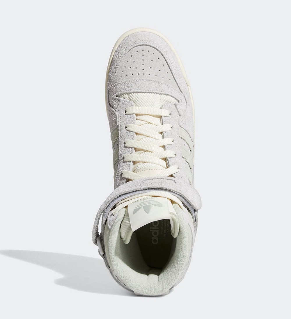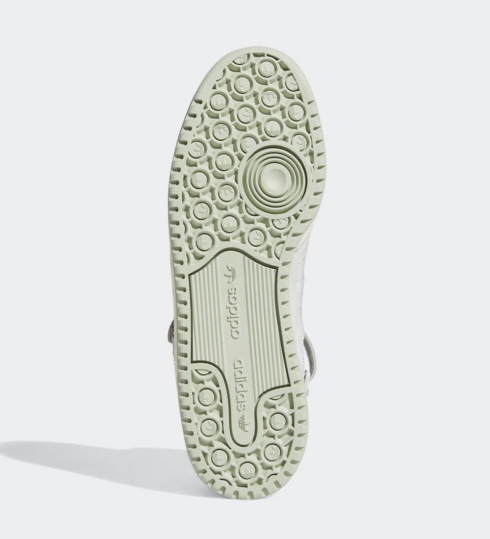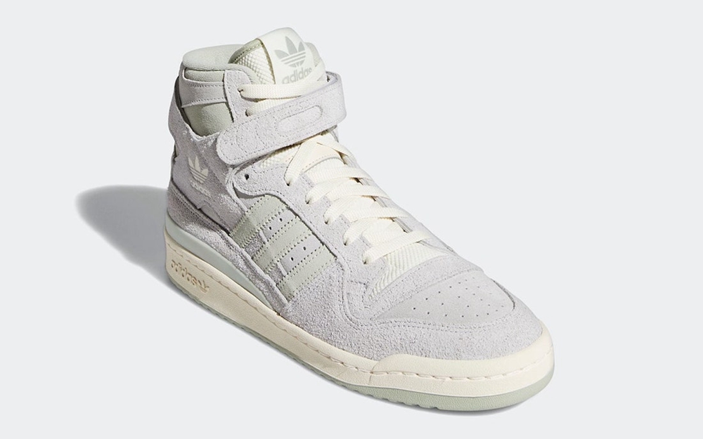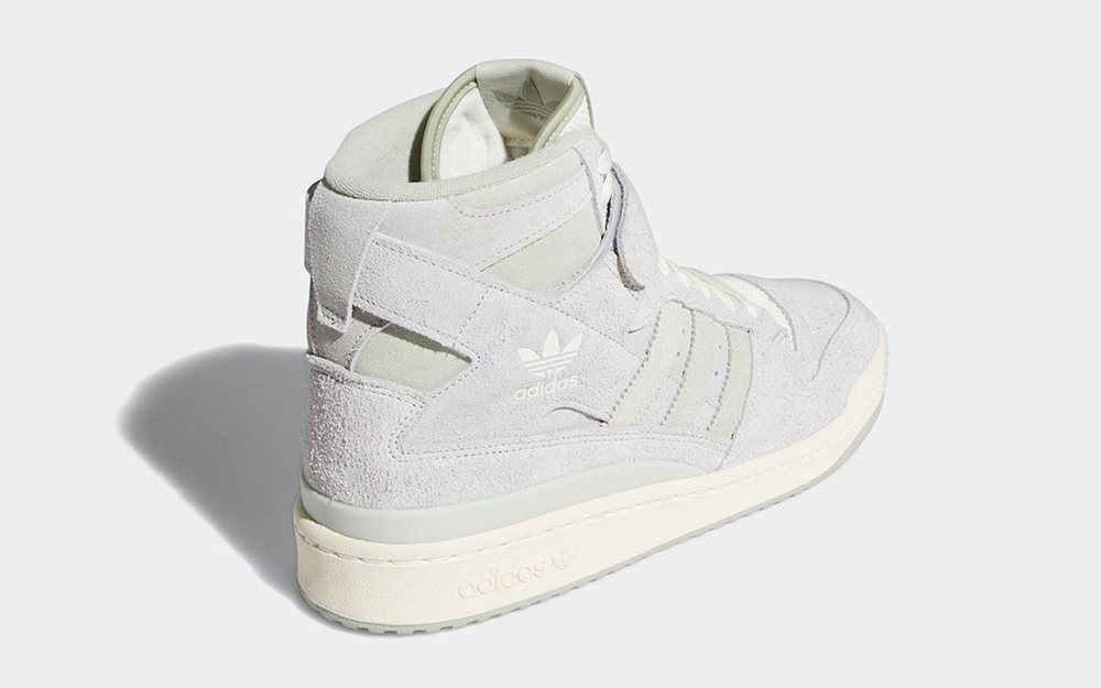 配色方面,采用大面积浅灰色搭配淡绿色,整体风格相当淡雅,鞋帮沿袭 Forum 84 High 传统魔术贴设计,保留原始味道。