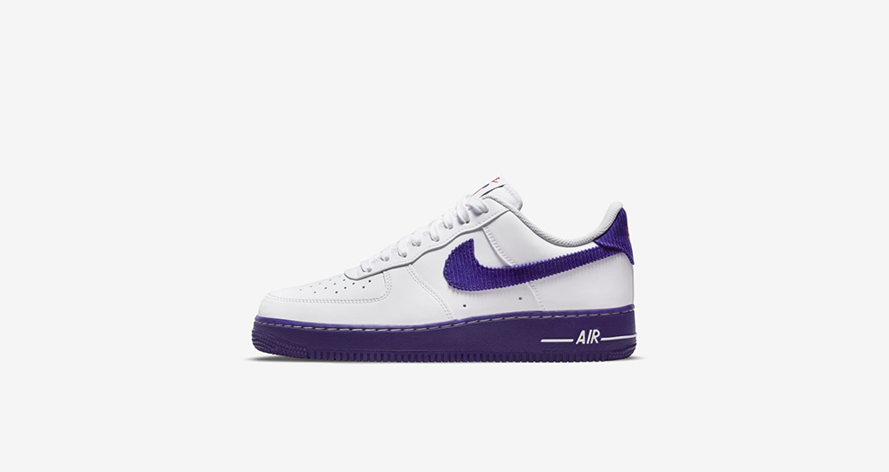 区别在于鞋面大面积白色皮革材质,侧身紫色 Swoosh Logo 则是灯芯绒。