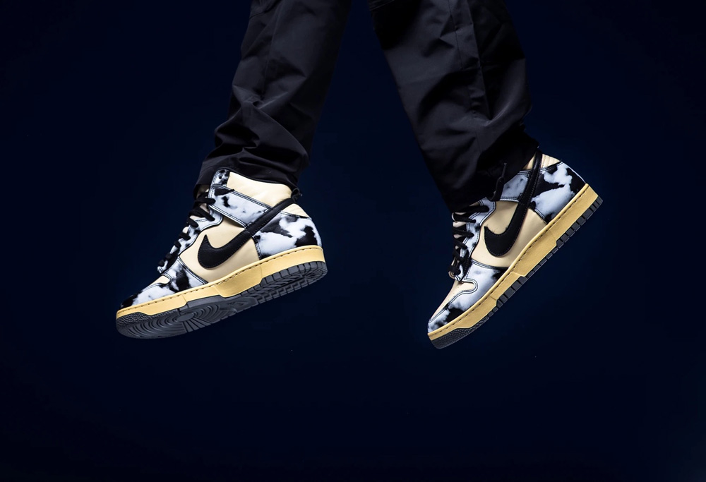 整双鞋以 Dunk High 1985 元年款为蓝本,鞋面采用酸洗工艺印花设计,让人眼前一亮。