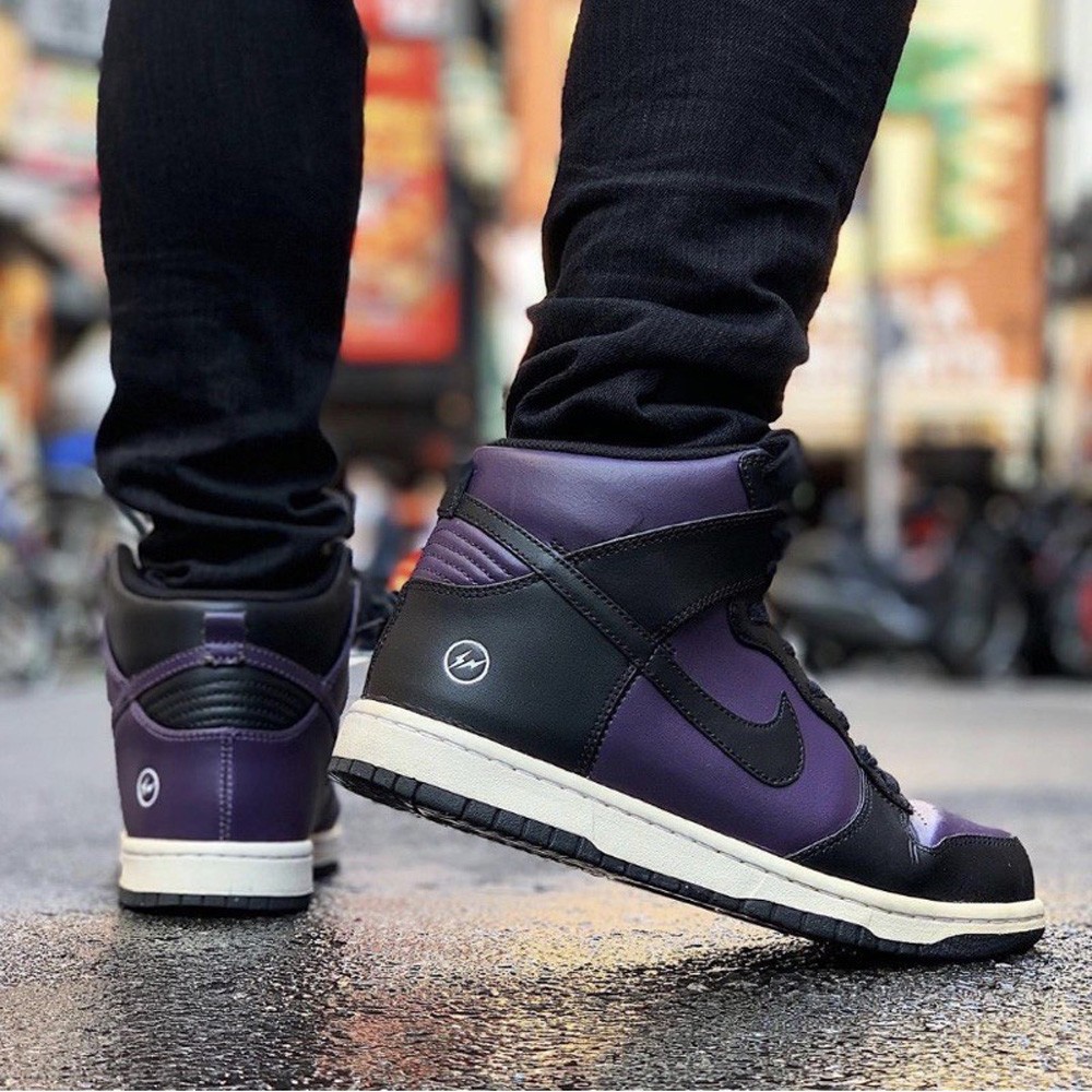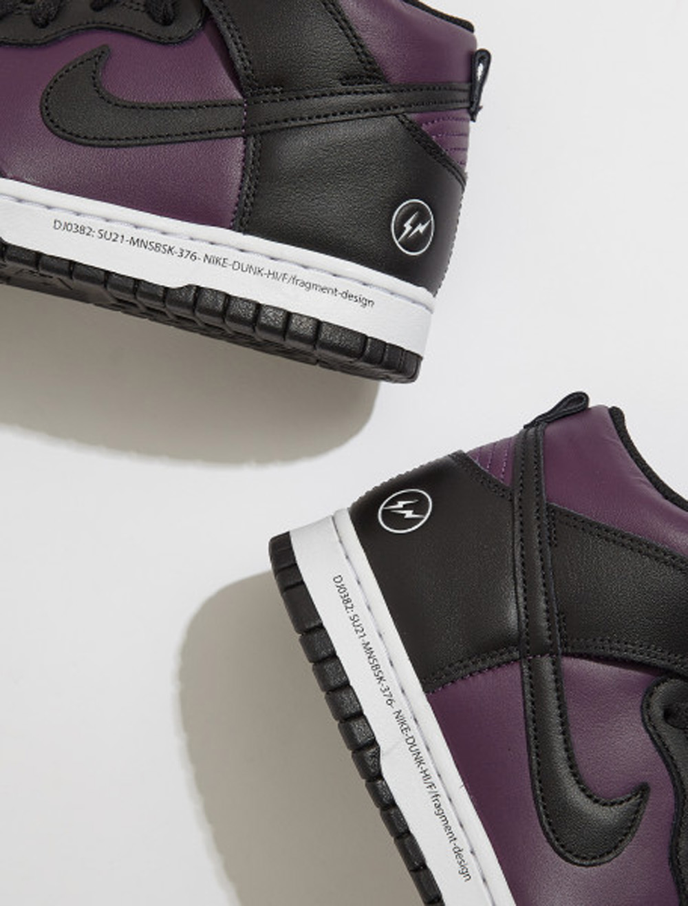 此次发售的 fragment x Nike Dunk High 没有采用 2010 年版本鸳鸯的设计,整双鞋以更加沉稳的黑紫装扮示人。