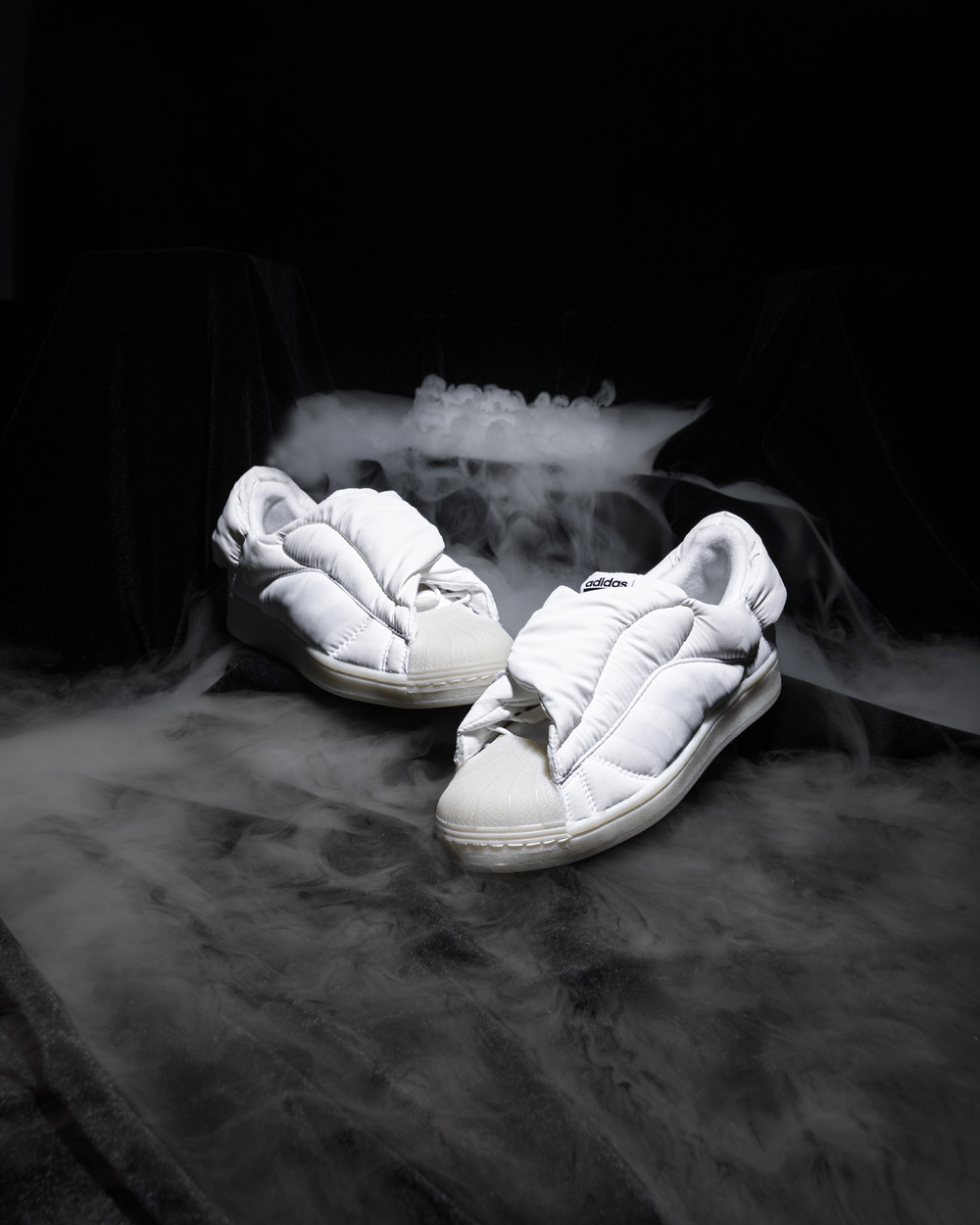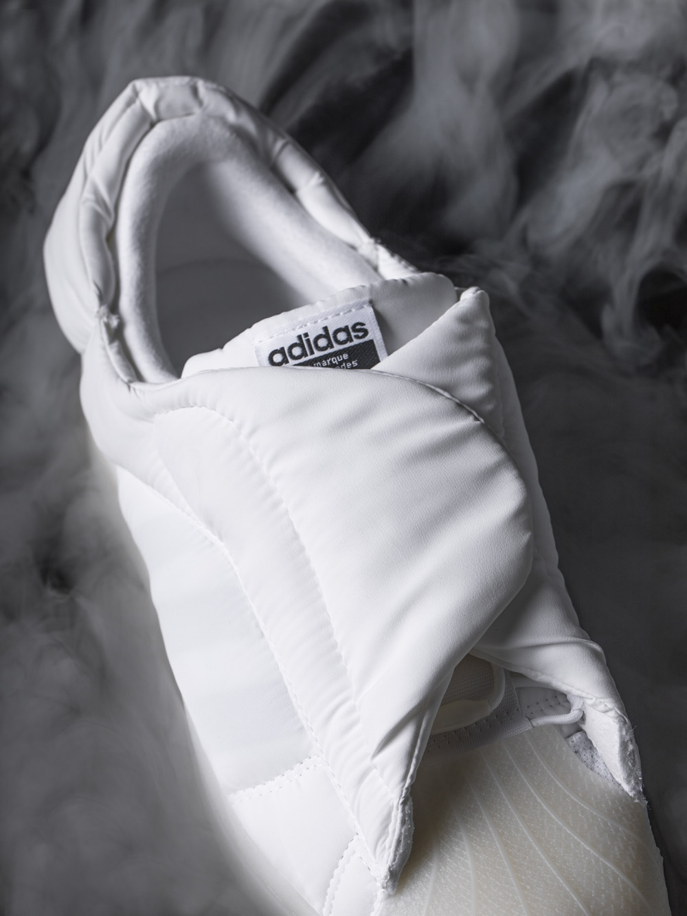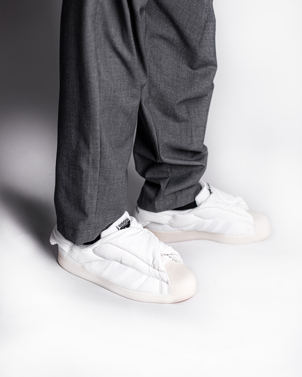 鞋面采用细腻的尼龙材质打造,尼龙与棉质填充物的结合打破了传统 Superstar 的设计逻辑,从 0 开始构建整双鞋的多个角度。