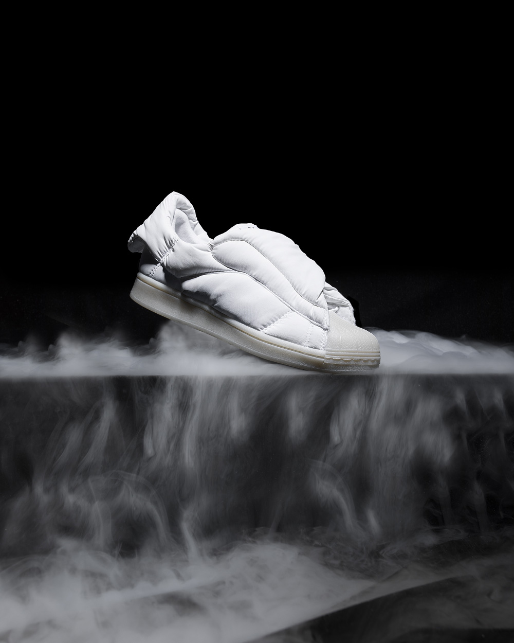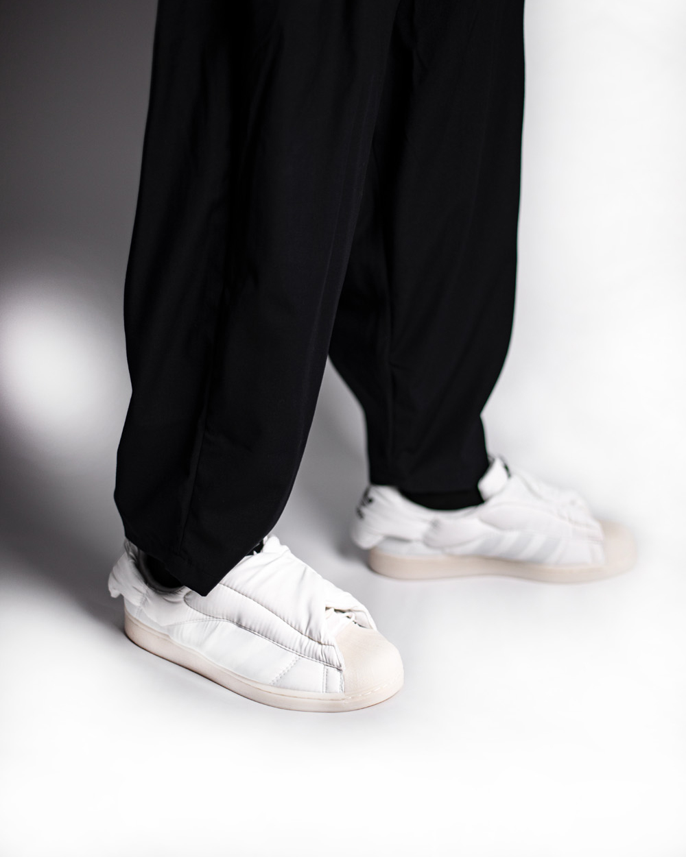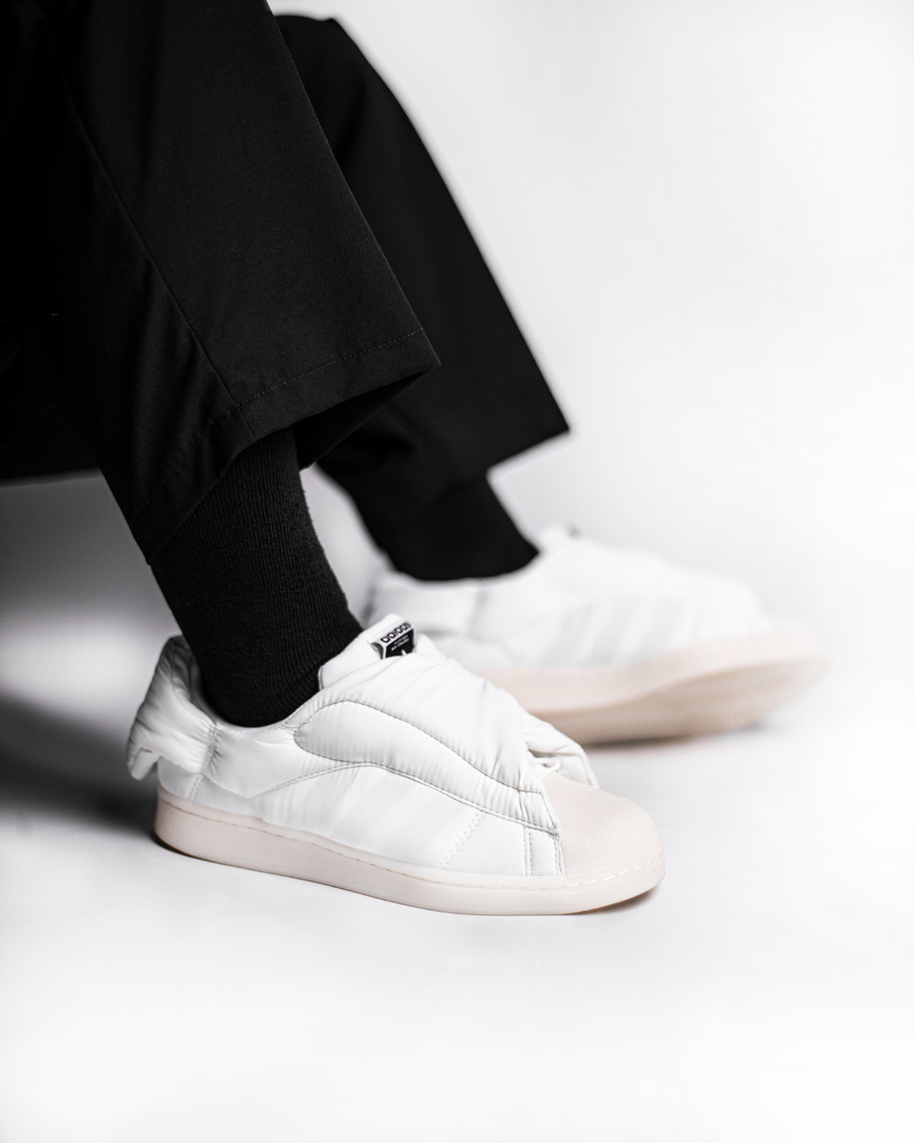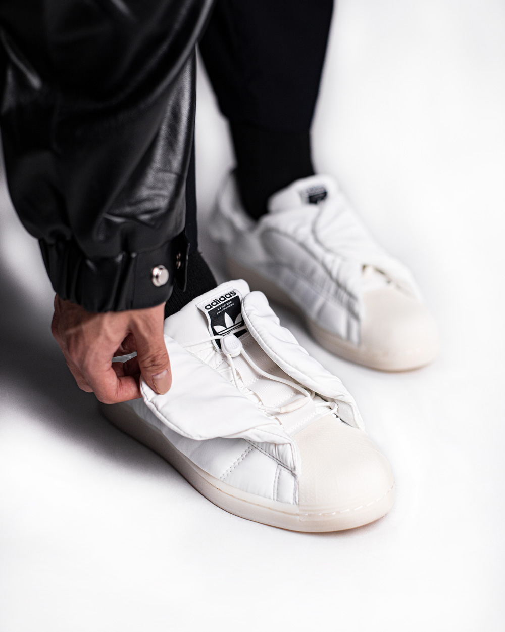 鞋面采用细腻的尼龙材质打造,尼龙与棉质填充物的结合打破了传统 Superstar 的设计逻辑,从 0 开始构建整双鞋的多个角度。