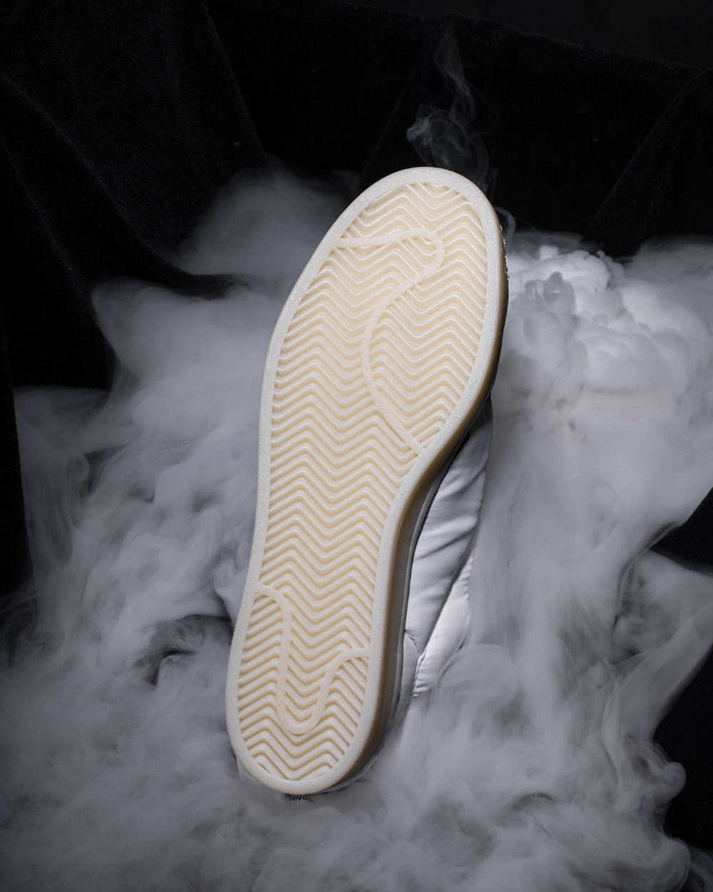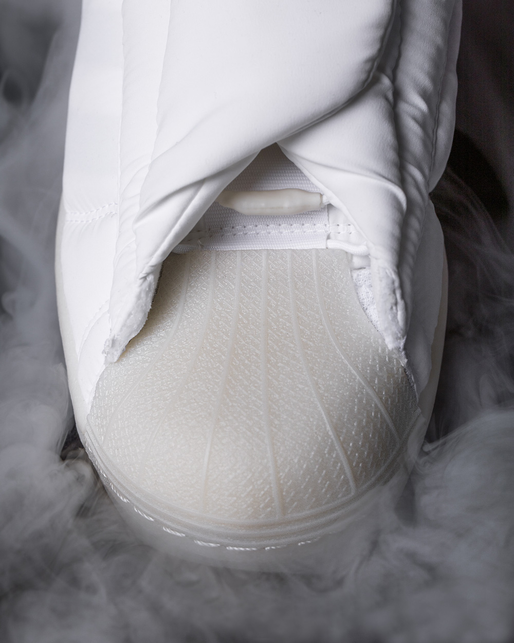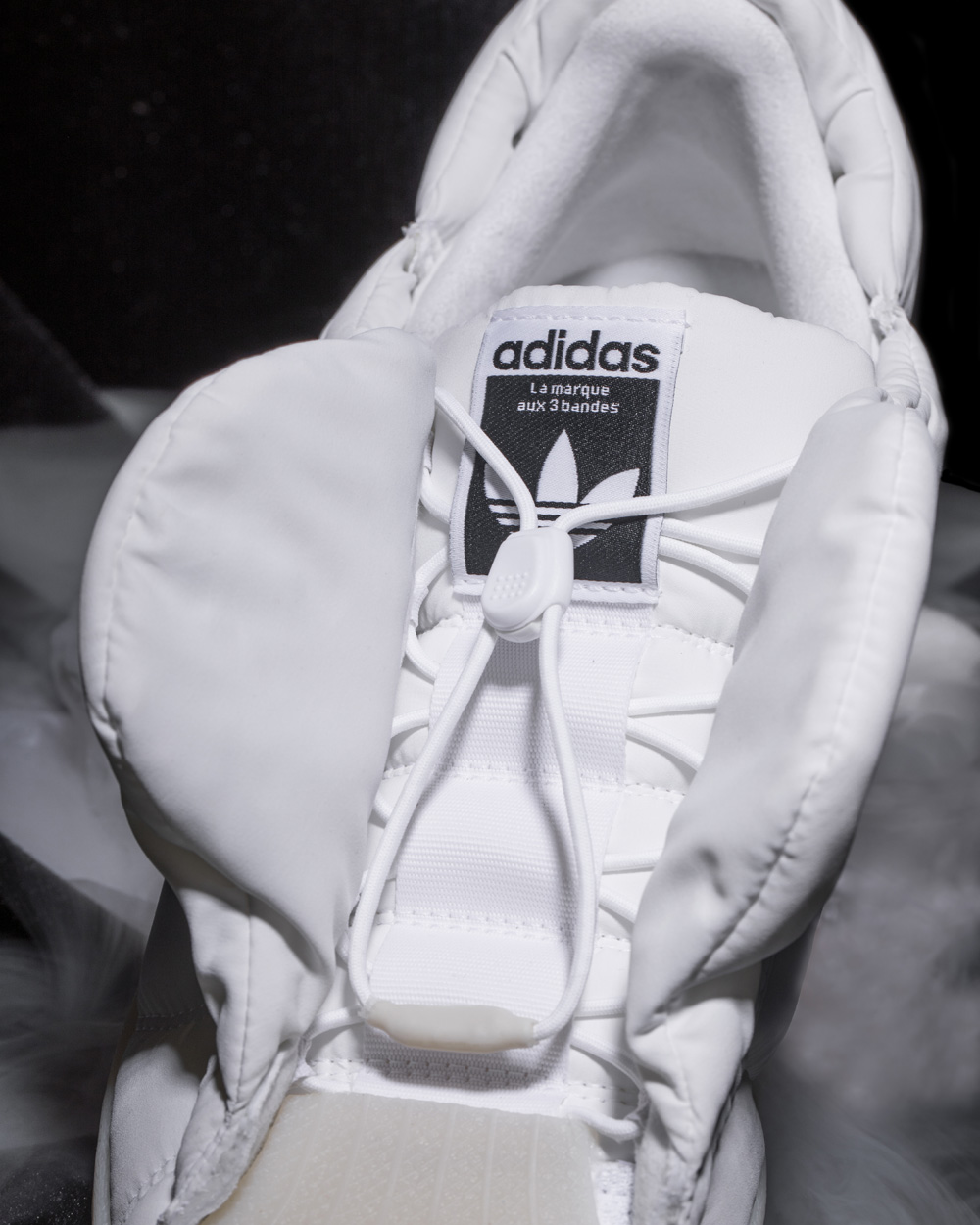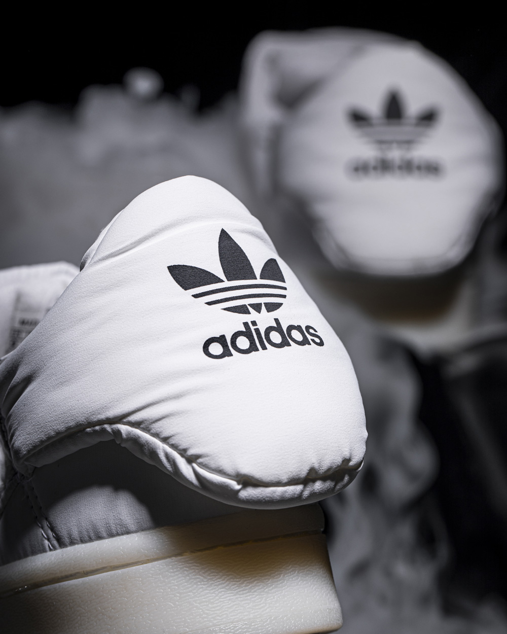 通过对于视觉概念的探索,构建新颖的的视角,白色款的鞋身侧面隐约透出标志性的三线 Logo,品牌标识不再是核心元素。