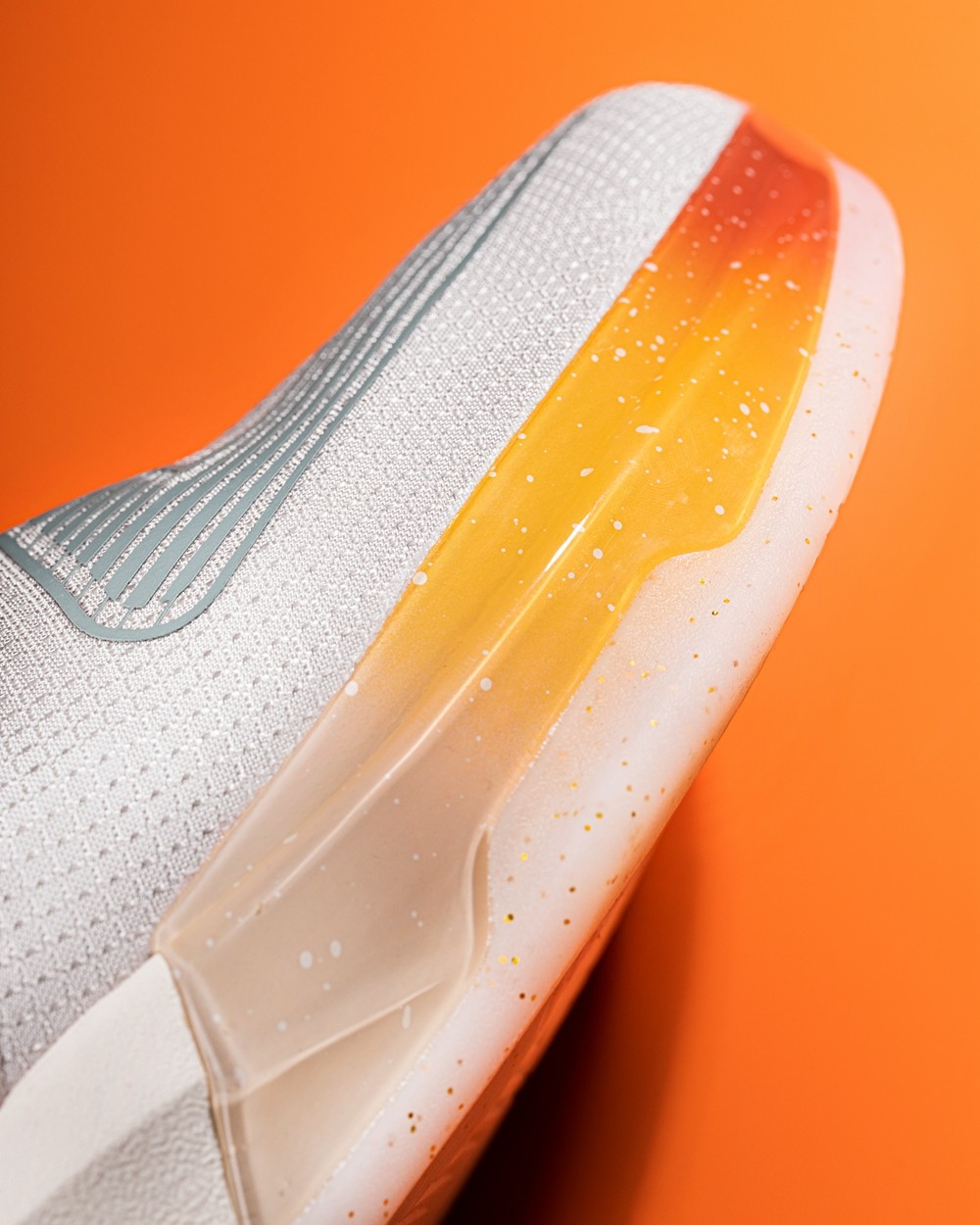 不仅如此,外底还内嵌一块长方形尼龙板稳定中底材料,加之外露的大面积异形 TPU,稳定足弓的同时带有助推作用。