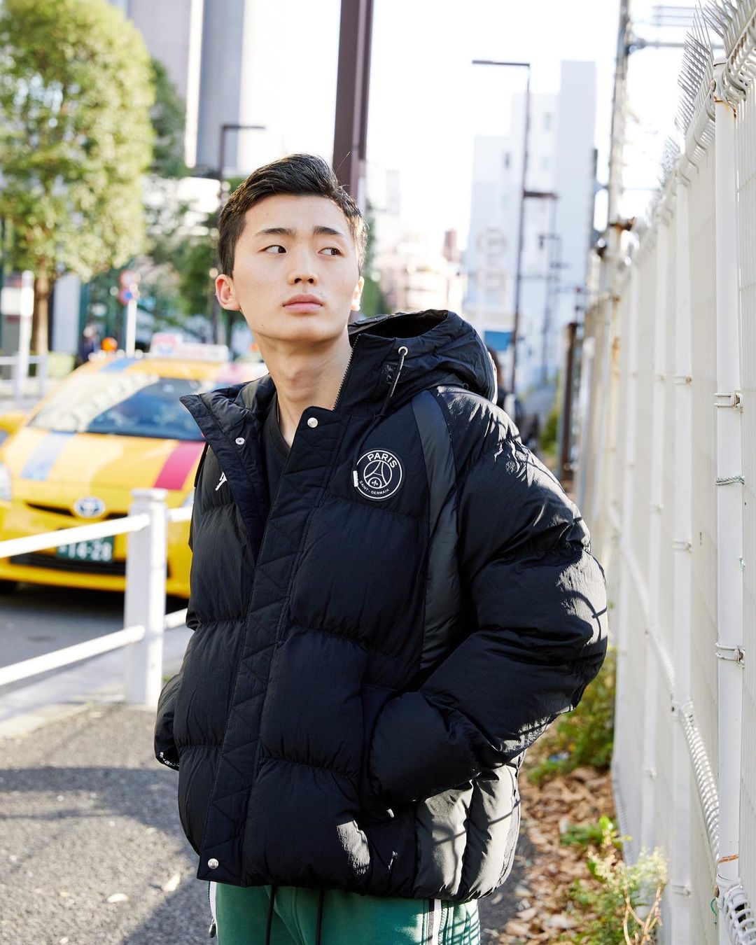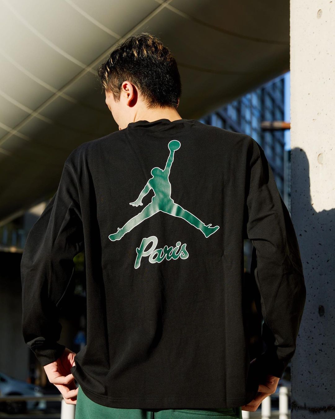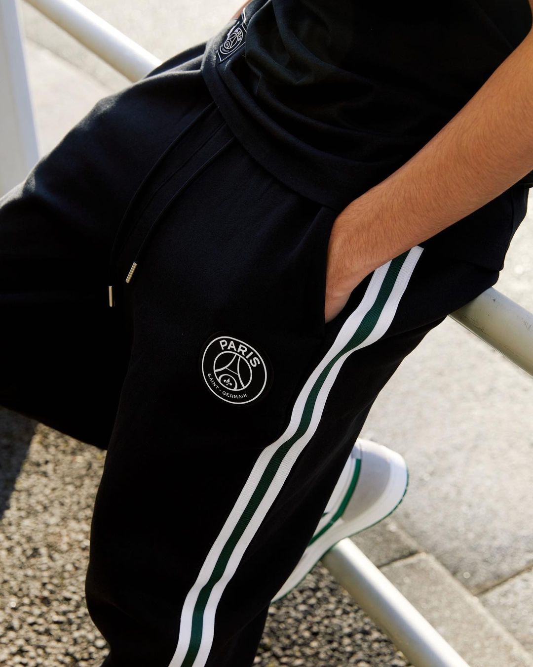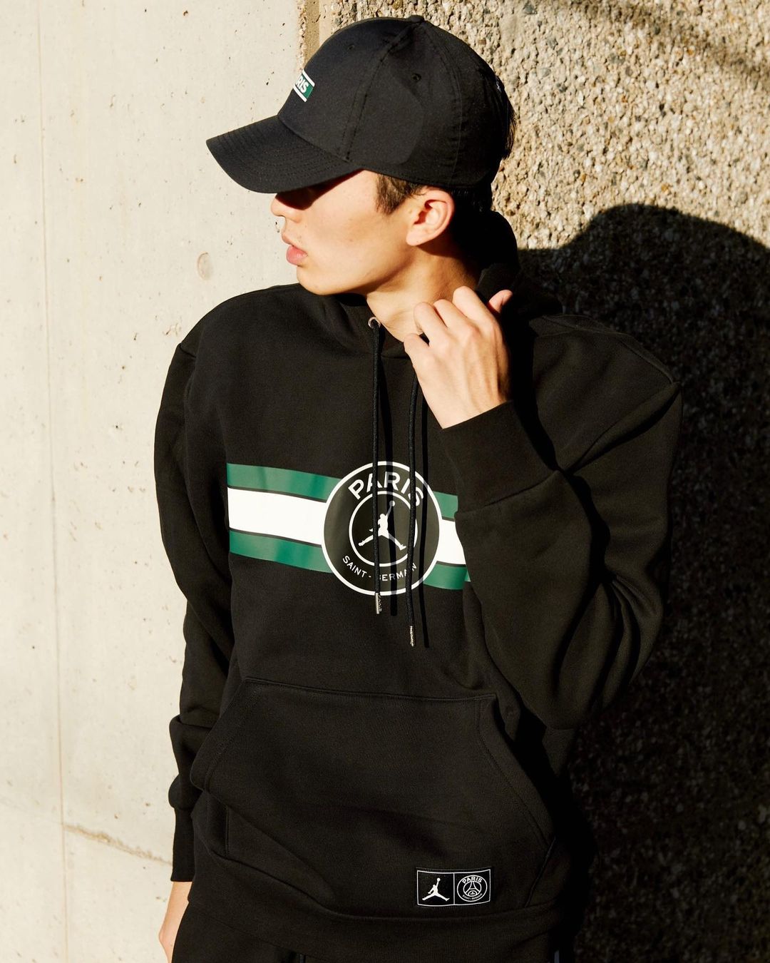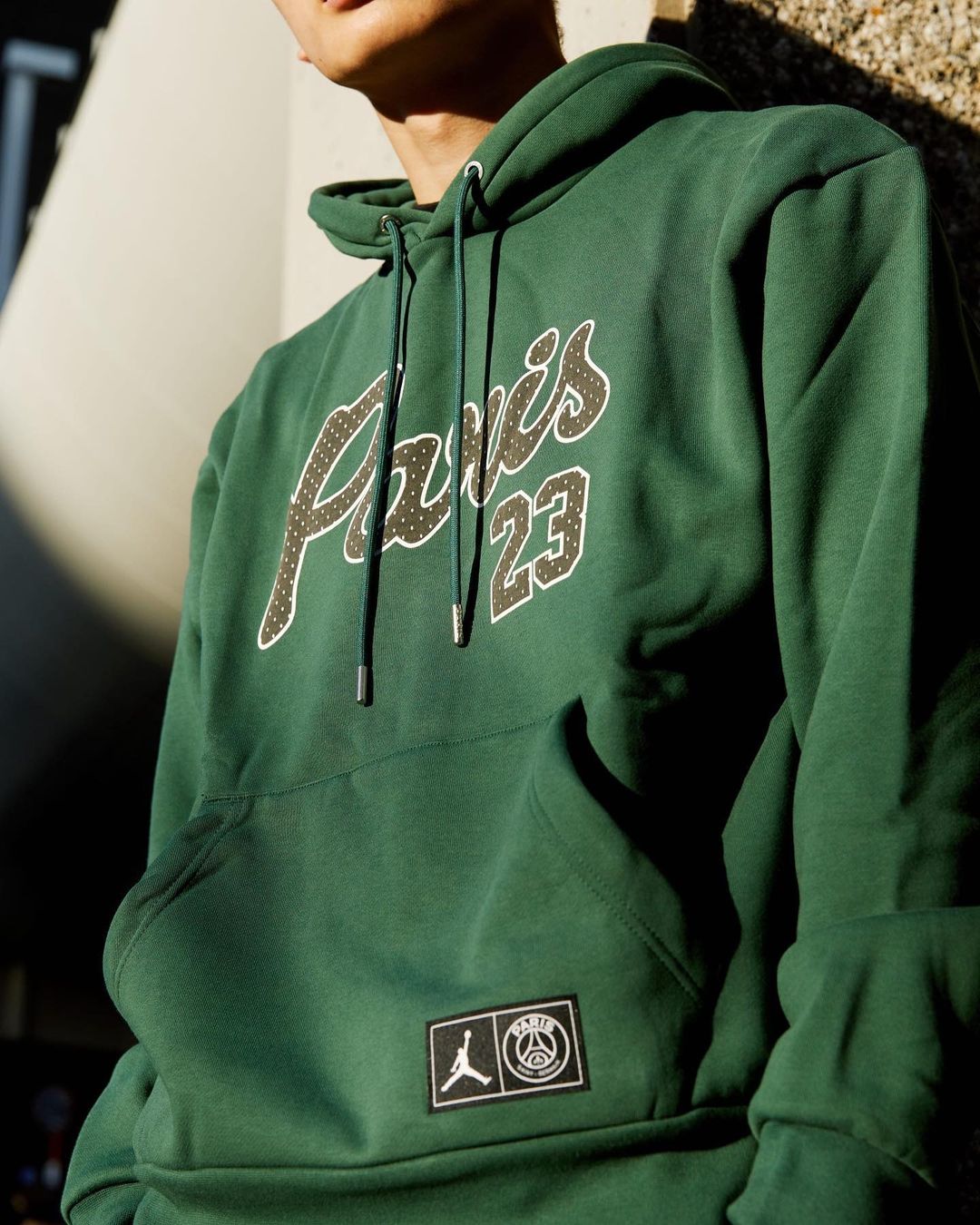 巴黎圣日耳曼和 Jordan Brand 的特色联名 Logo 依旧是每件单品中最醒目的点缀,绿色增添了一分复古校园风的气质。
