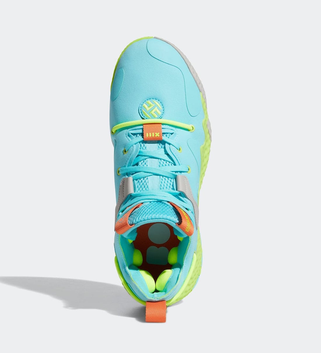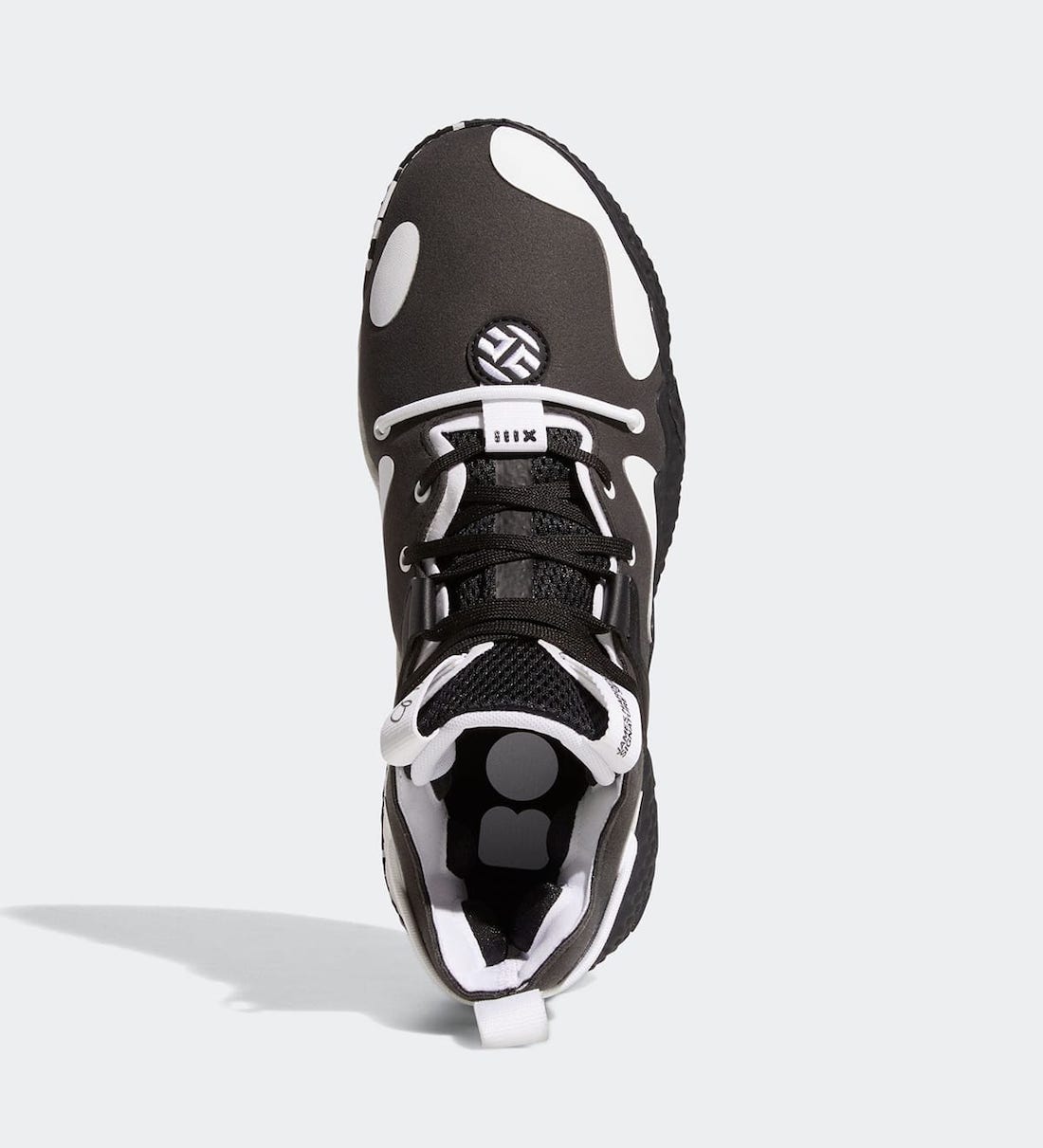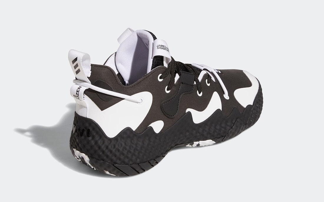 设计趋向解构风,并且融入许多圆形和曲线的元素,例如贯穿鞋头的红色鞋带,以及缝合上去的哈登 Logo。