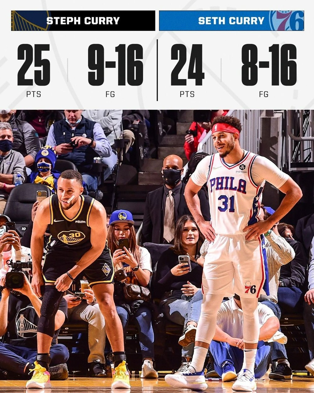 与此同时,另一边的勇士主场对阵 76 人的比赛中,库里兄弟迎来正面对决,最终兄弟二人分别砍下25 分和 24 分,勇士队拿下胜利。
