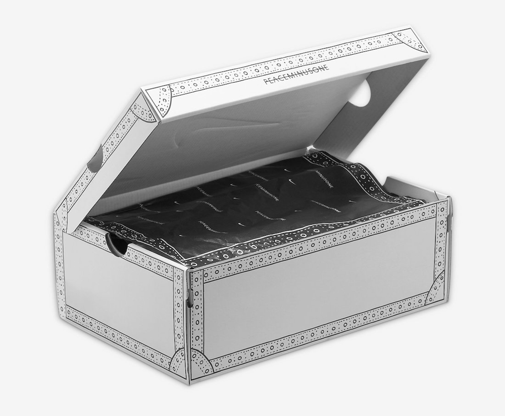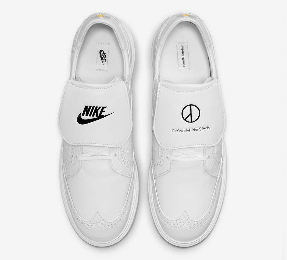 翻转的超大鞋舌为可拆卸设计,分别印有 PEACEMINUSONE 和 Nike Logo 彰显联名身份。