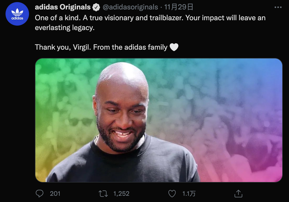 运动品牌中,与 Virgil 曾密切合作的 Nike、Jordan Brand 也发文缅怀,就连 adidas Originals、PUMA 都在官方 Twitter 账号发表悼念。