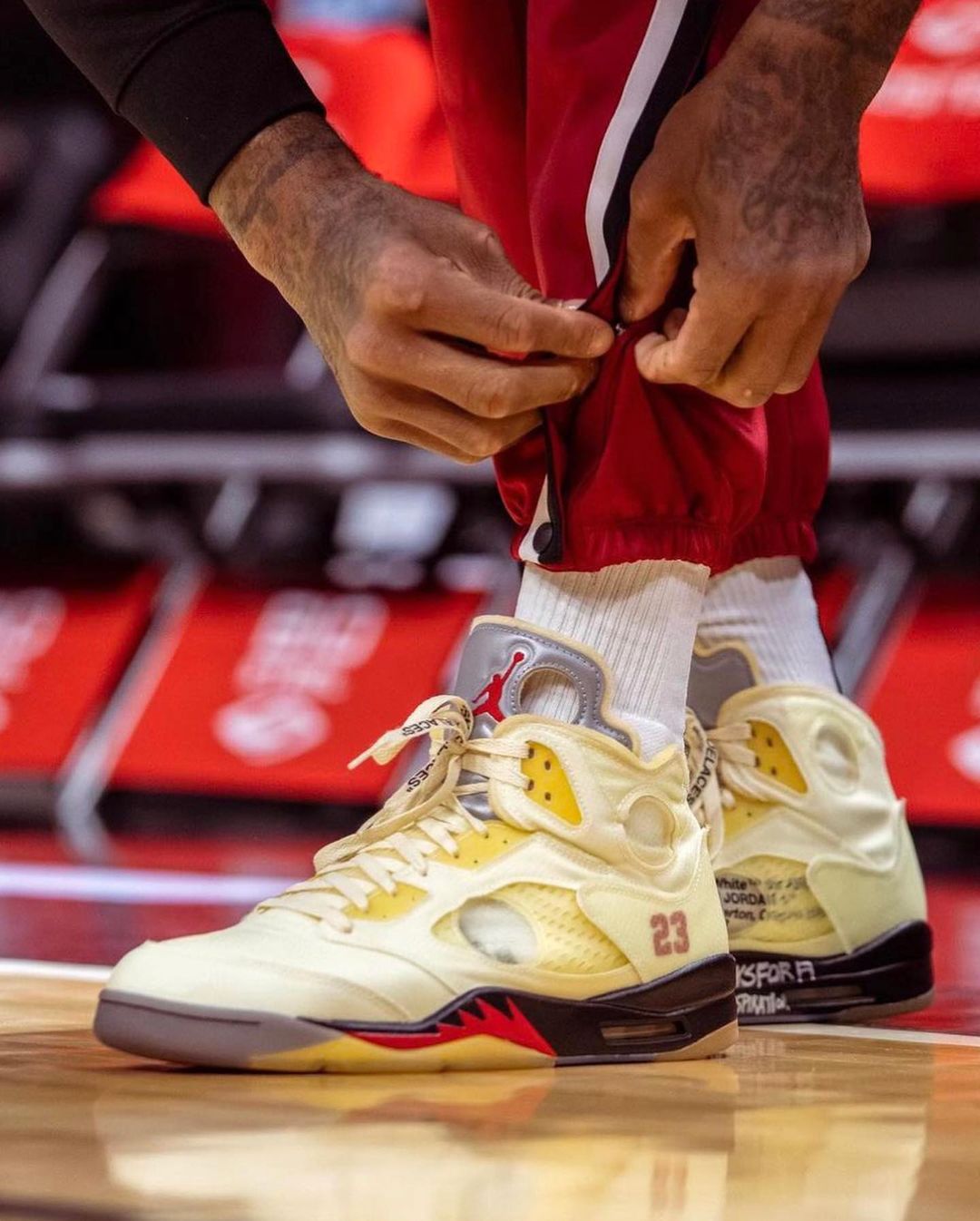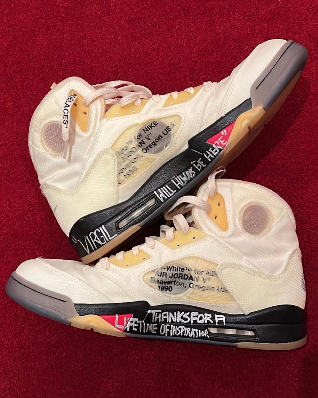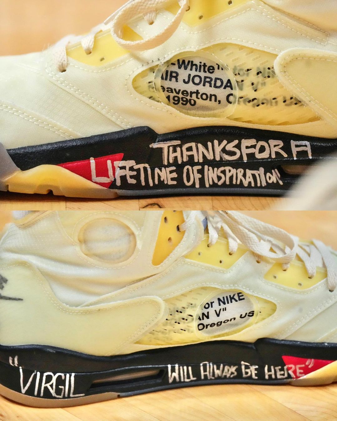 比赛中穿上 OFF-WHITE x Air Jordan 5 之后终于揭开了玄机,塔克用银色马克笔在中底内侧写上了 “"VIRGIL WILL ALWAYS BE HERE"” 与 “THANKS FOR A LIFETIME OF INSPIRATION”,用 Virgil 的代表性设计向他本人致敬。