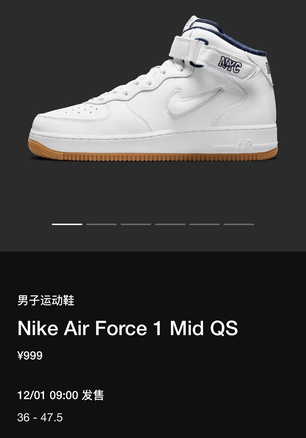 据悉,全新配色 Nike Air Force 1 Mid QS 已于国区 SNKRS 上架,并将在 12 月 1 日正式发售,发售价格为 ¥999 元,感兴趣的朋友不妨提前做好入手准备。
