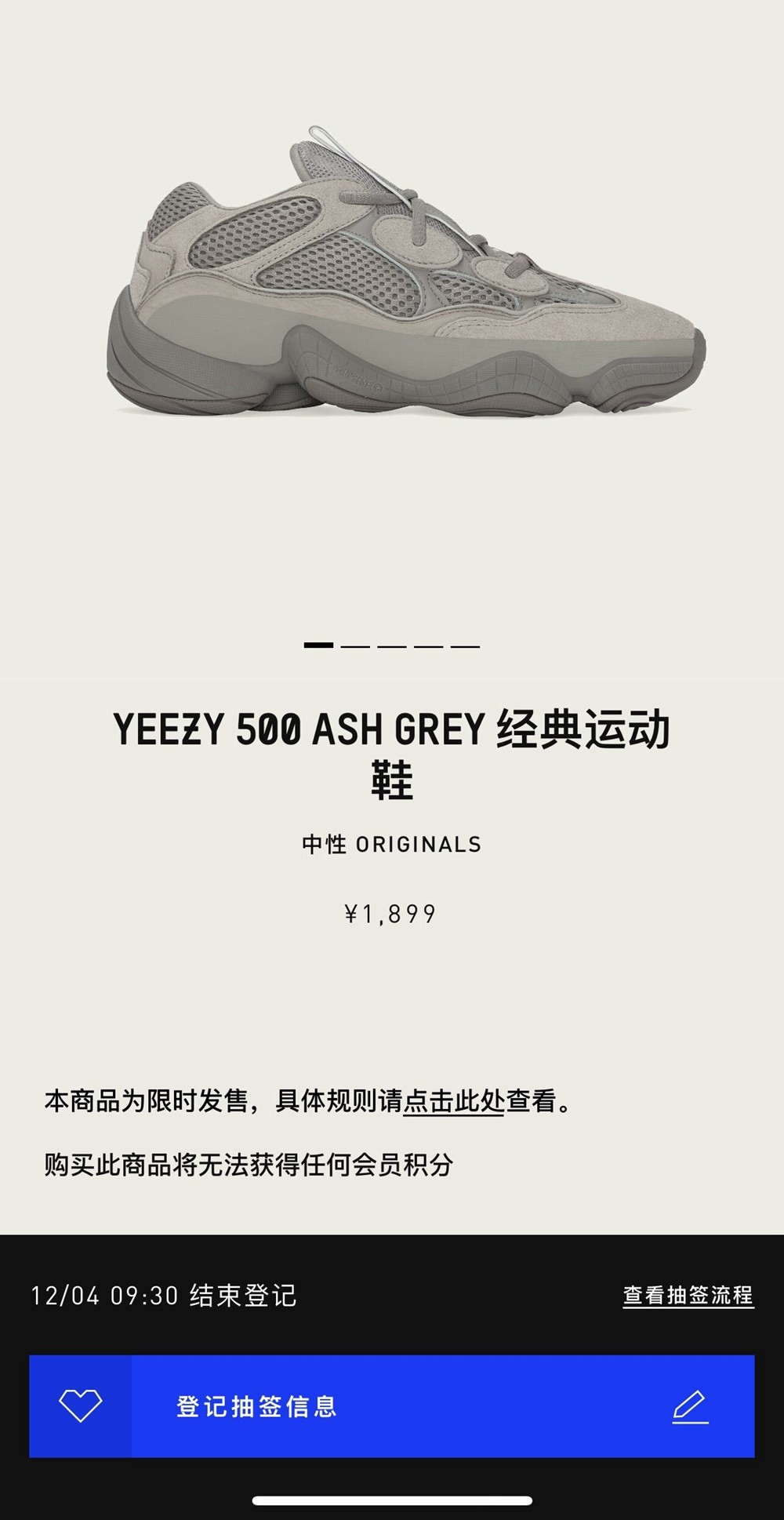 据悉,全新配色 adidas Yeezy 500 “Ash Grey” 现已在 CONFIRMED APP 开启登记,并将于 12 月 4 日上午 9 :30 结束登记,发售价格为 ¥1899 元,喜欢的朋友不妨抓紧时间登记!
