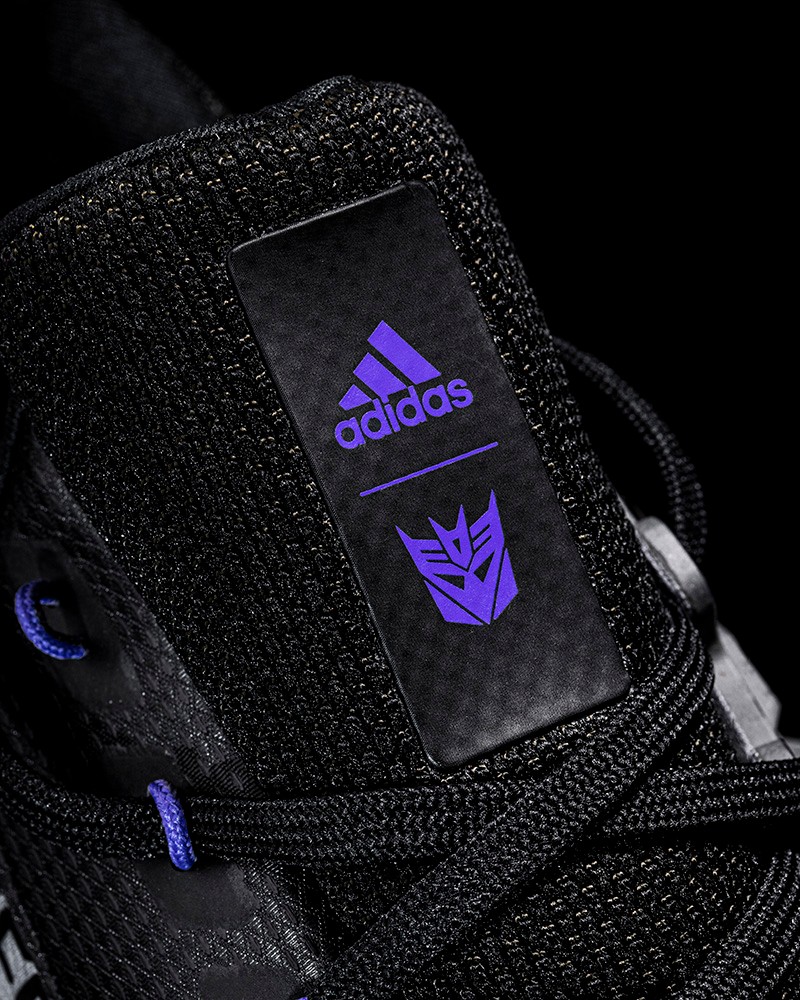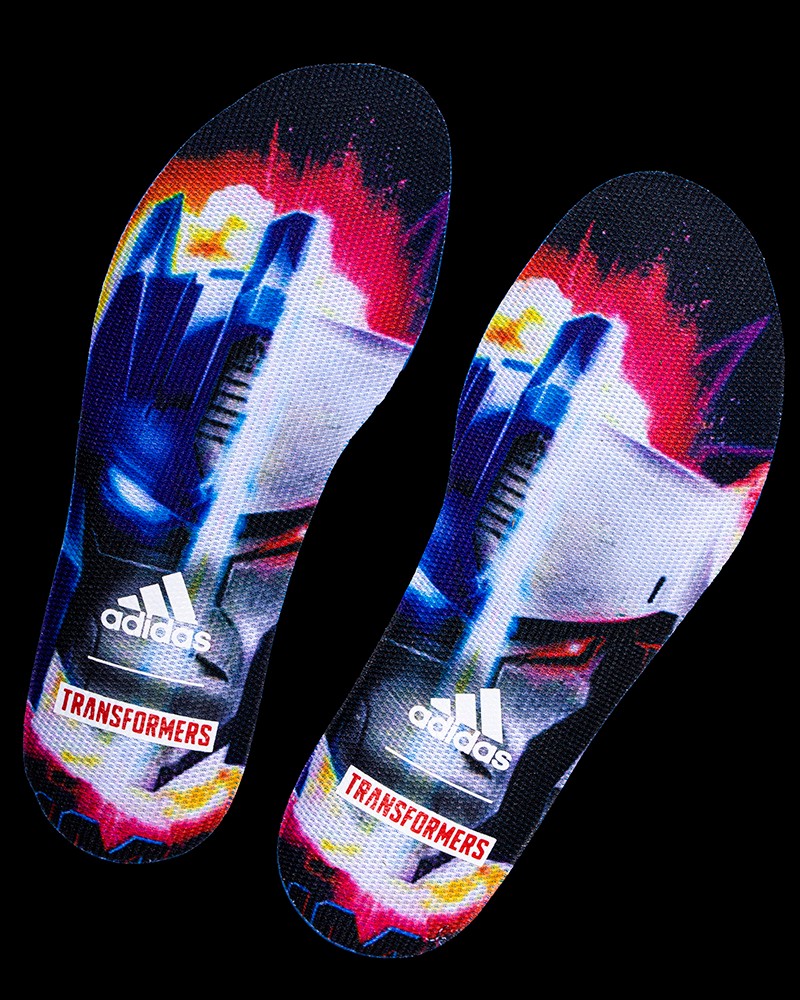 鞋垫注有 TRANSFORMERS 与 adidas Logo,并满印擎天柱与威震天的头雕对撞,强调双方在地球与赛博坦星球间势均力敌的对战纠葛。