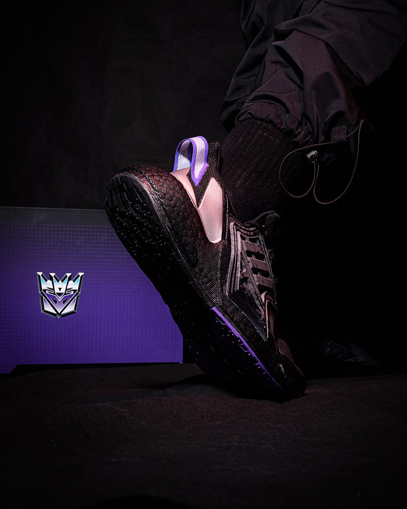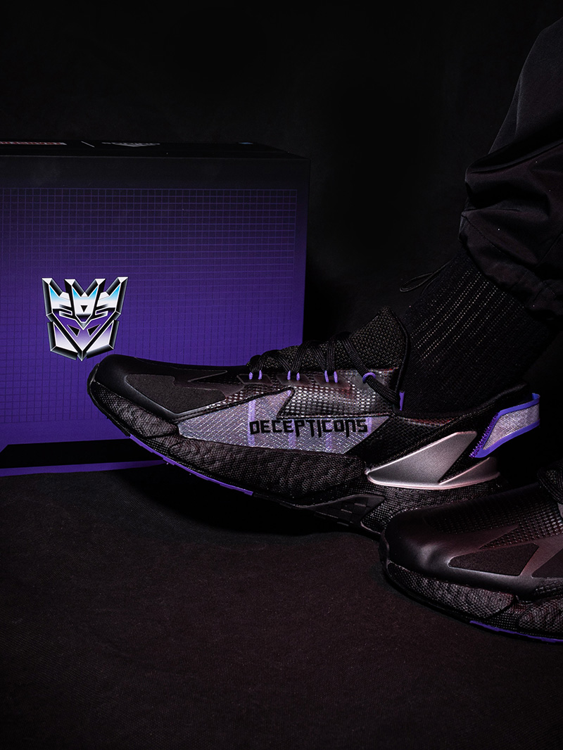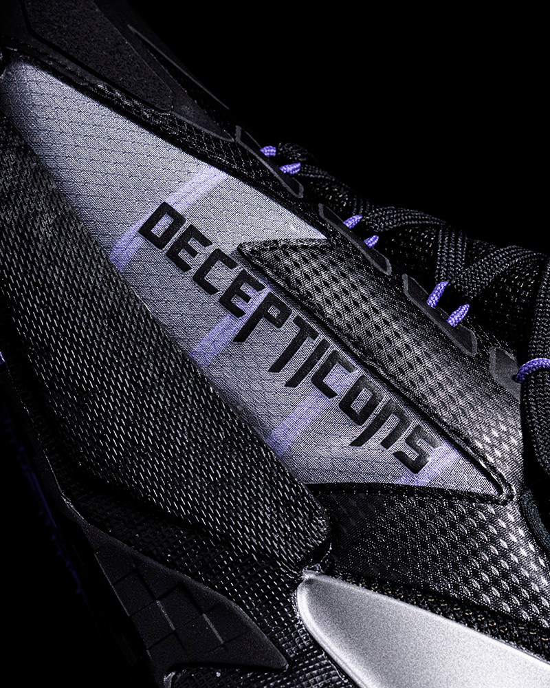 鞋身内侧蝉翼压印「DECEPTICONS」字样与鞋舌霸天虎图标相呼应,点名霸天虎的独占身份。