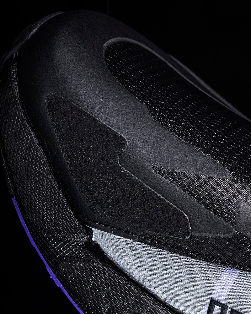 鞋面采用透气织物与类似蝉翼的网面共同打造,兼具轻量化、透气性的同时,更赋予酷黑独有的光泽质感。