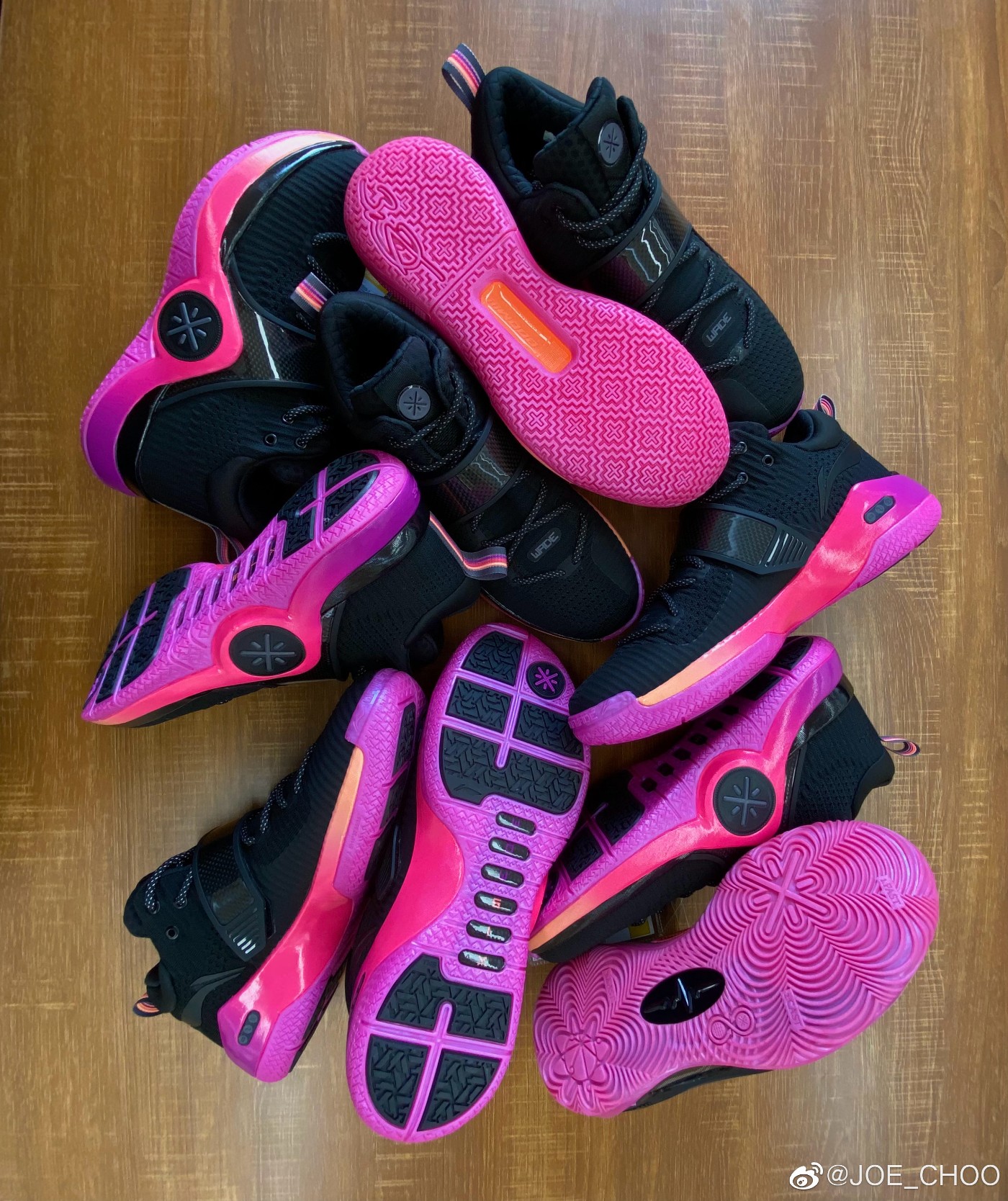 仔细观察就会发现,这一堆鞋中可不止韦德之道 6,还有两款神秘新鞋的鞋底,同样是以晨曦配色呈现。