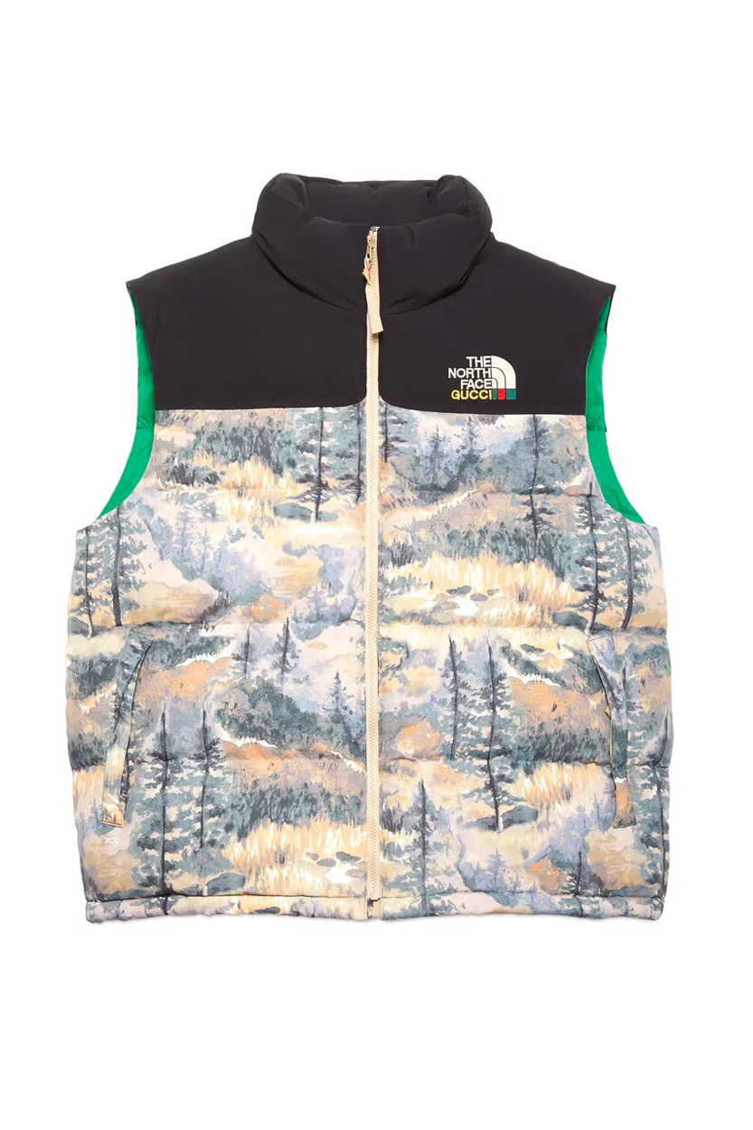 全绿的羽绒马甲,满印 Gucci 印花,搭配硕大的 Gucci x TNF 融合 Logo,吸睛程度直接拉满。