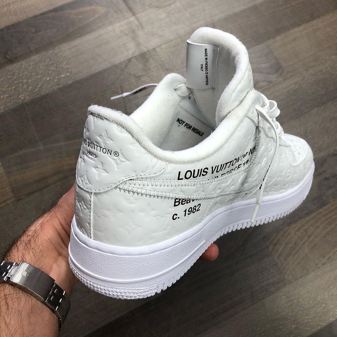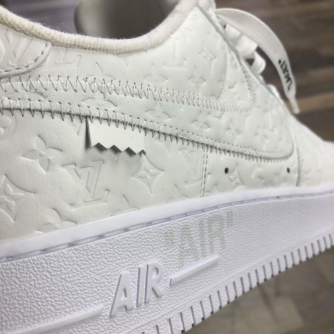 整双鞋采用通体白色打造,鞋身满印有 LV 老花,外侧 Swoosh 和内侧解构字样,都极具 Virgil 设计风格,遵循着以往联名的细节。