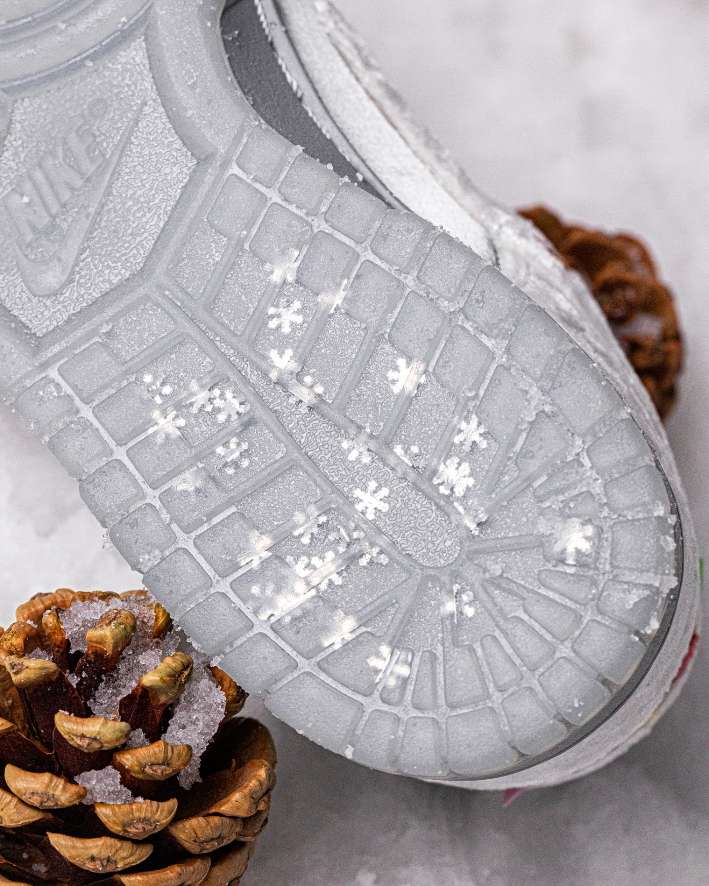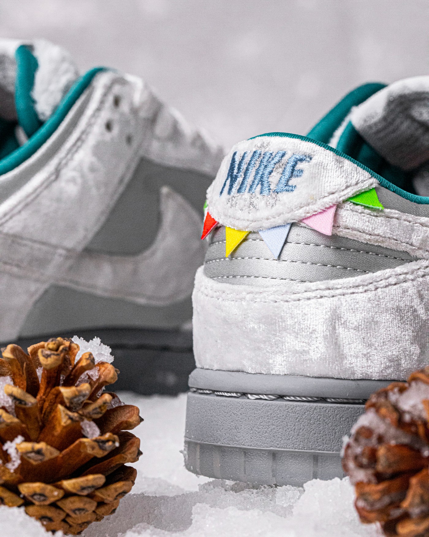 后跟点缀刺绣的冰蓝色 “NIKE” 字样与银色雪花图案,还有类似小彩旗的巧妙设计,让人瞬间就想到在公园里滑冰车的童年回忆。
