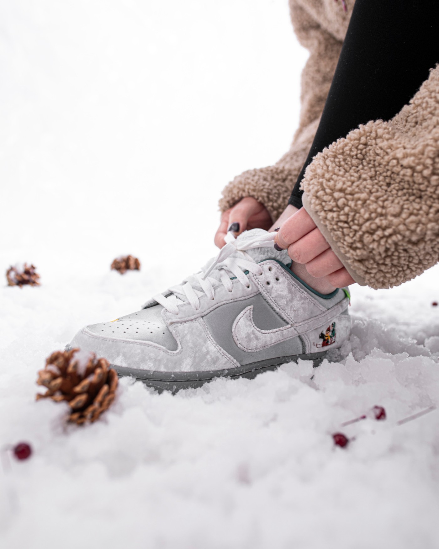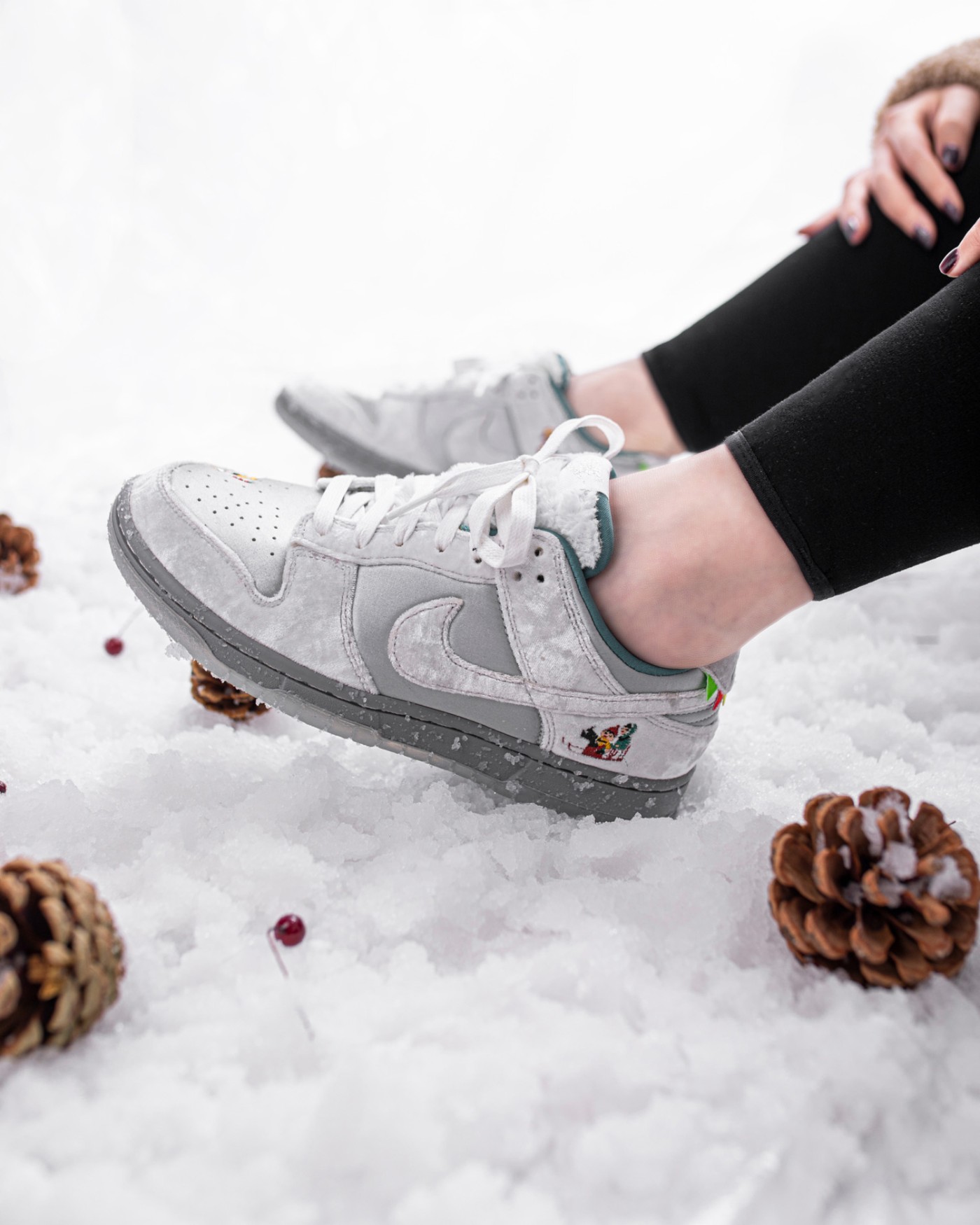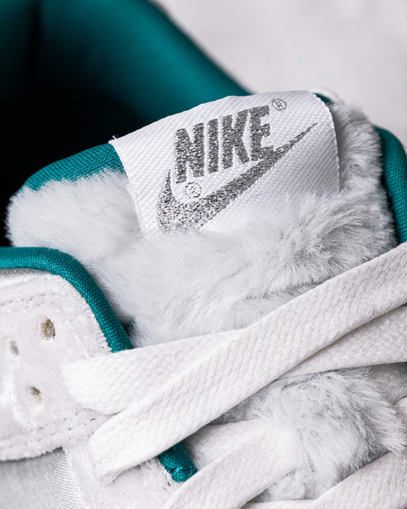 鞋舌上 BlingBling 的银色 Nike Logo 呼应冬日主题,人造兔毛增添了毛绒绒的可爱气质。