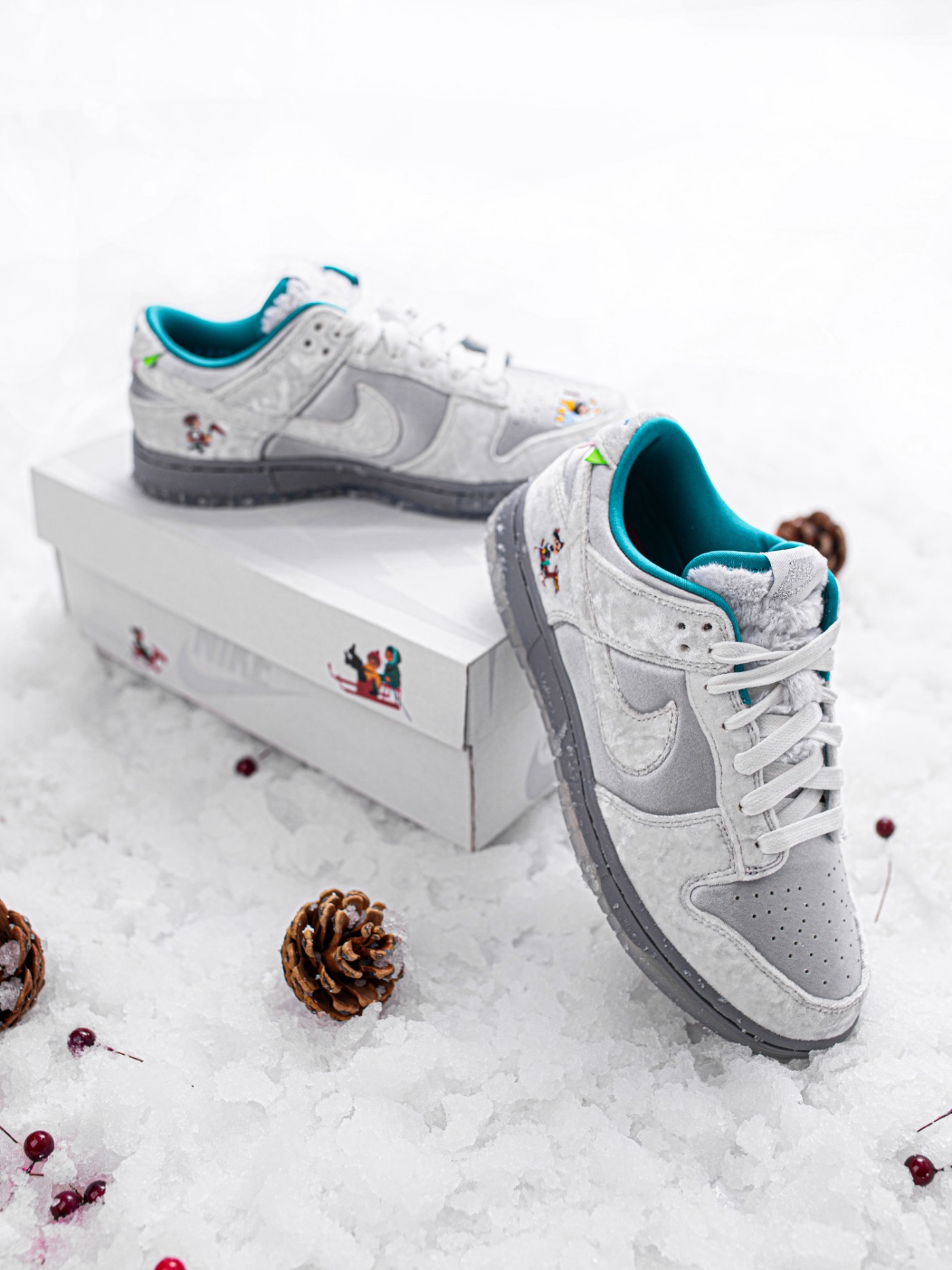 整体风格像是将「情人节」StrangeLove x Nike Dunk SB Low 和「冰雪奇缘」Sean Cliver x Nike SB Dunk Low 这两双超人气鞋款合二为一。