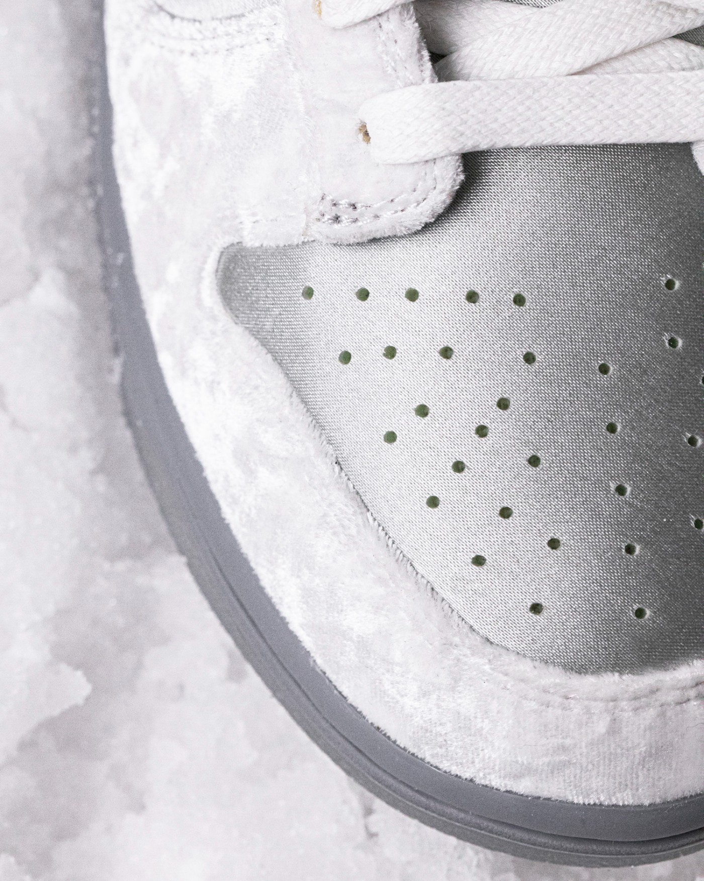 整双鞋以白色和银灰色为主调,鞋面使用丝绒与绸面质感的材质拼接,感觉上就非常适合冬天。