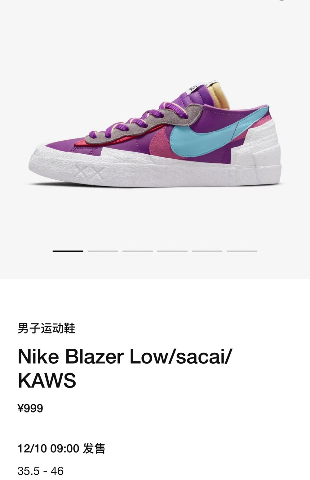 据悉,全新 sacai x KAWS x Nike Blazer Low “Purple Dusk” 将于 12 月 10 日上午 9 点开启发售,发售价格为 ¥999 元,又到了拼手速的时候了,小编在这里祝大家好运。