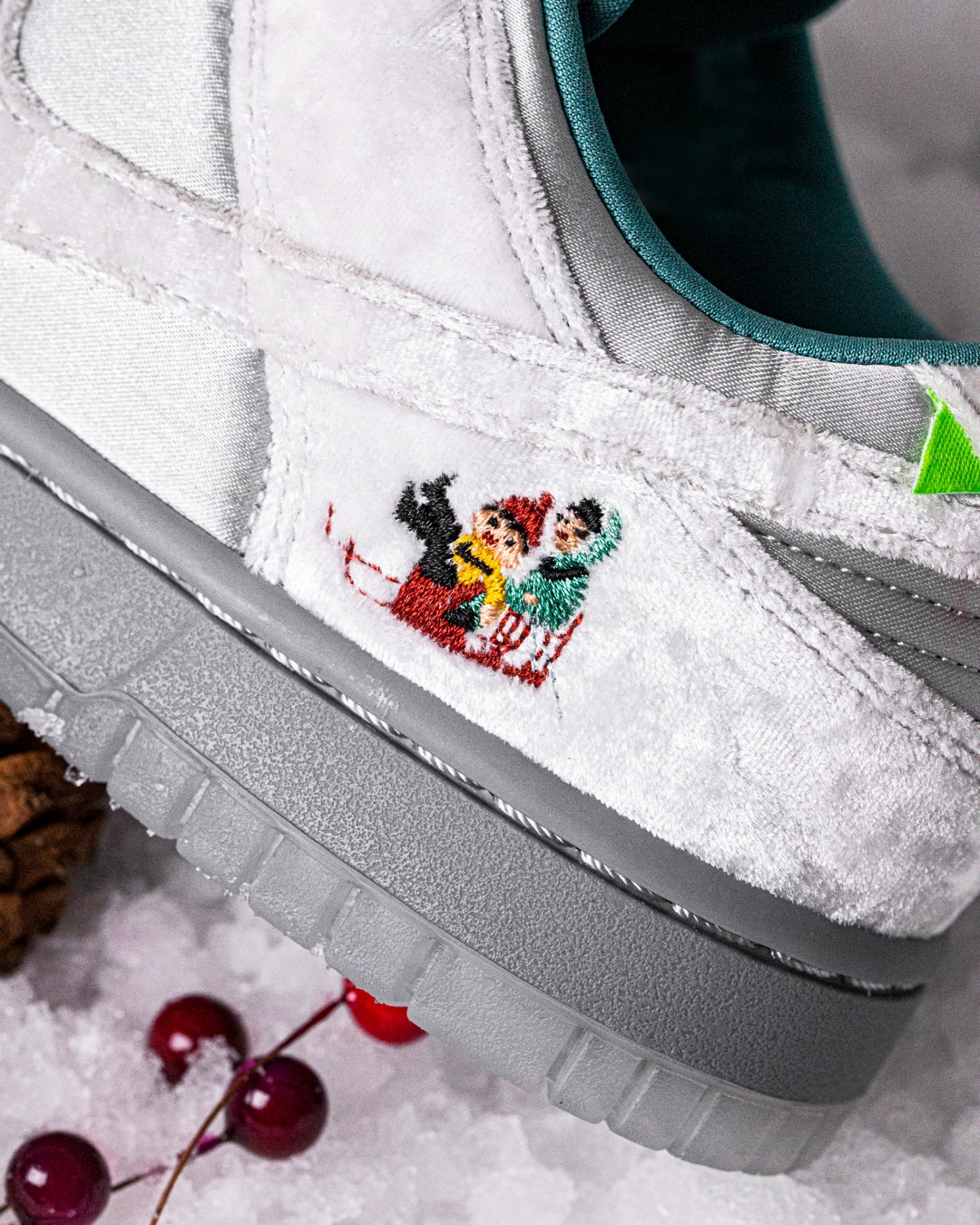 而另一个鞋款 Nike Dunk Low “Ice”,鞋面由丝绒、绸面打造,搭配鞋舌上的人造兔毛,为整双鞋增添了毛绒绒的可爱气质。