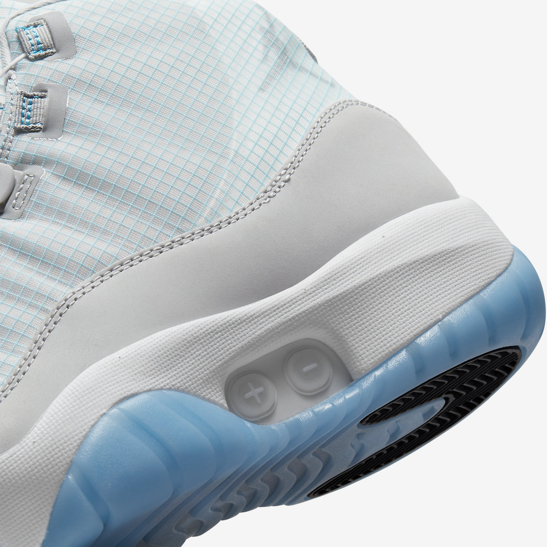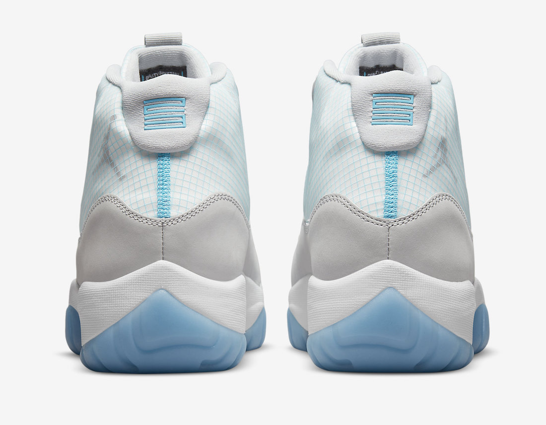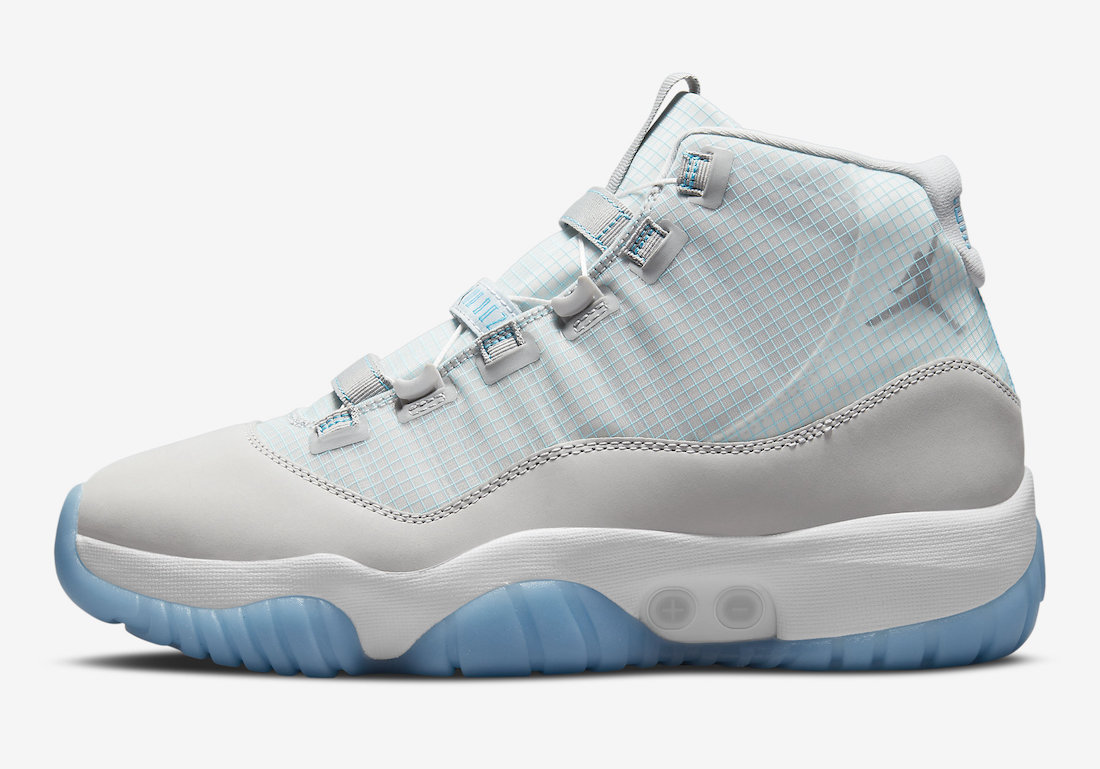 鞋面则是网格布材质,灰色底色以及蓝色线条还原经典的「传奇蓝」Air Jordan 11。