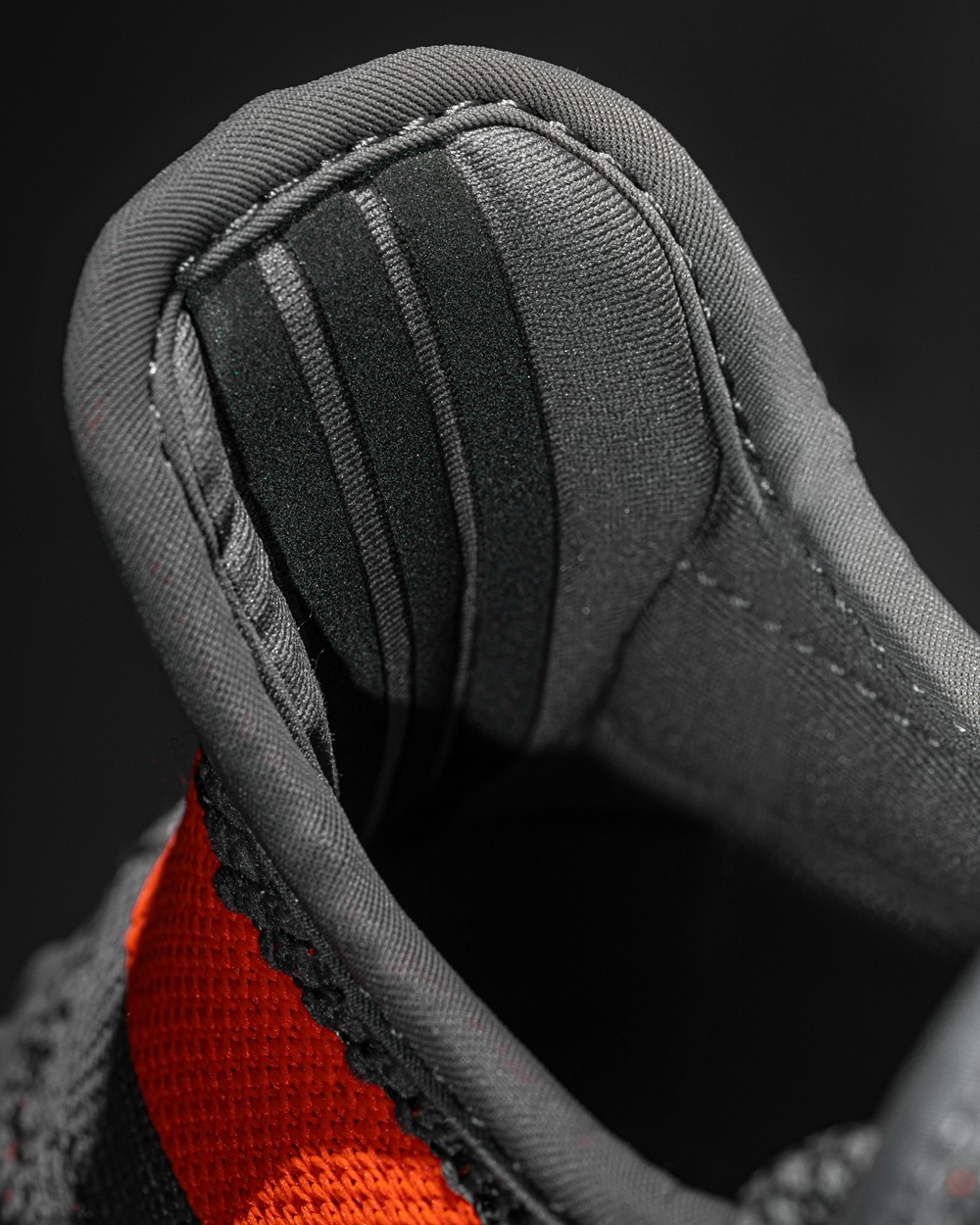 鞋面延续织物打造,其中夹杂深浅不同的两种灰色,形成经典的 “斑马” 纹理,另外仔细观察还会里面夹杂橙色缝线。