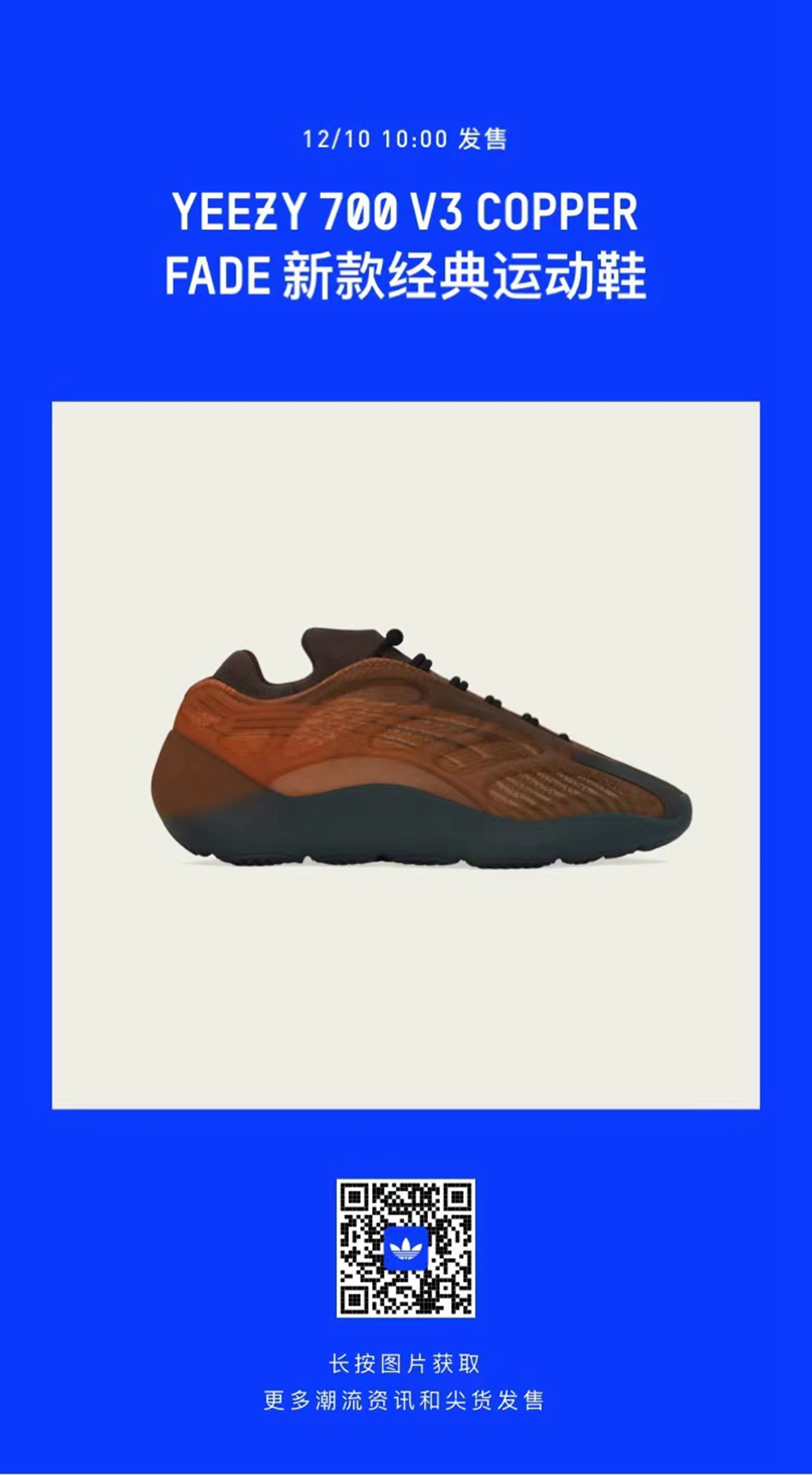 全新 YEEZY 700 V3 “COPPER FADE” 将在 12 月 10 日上午 9:30 截止登记,并将在 10:00 正式发售,发售价格为 ¥1899 元。