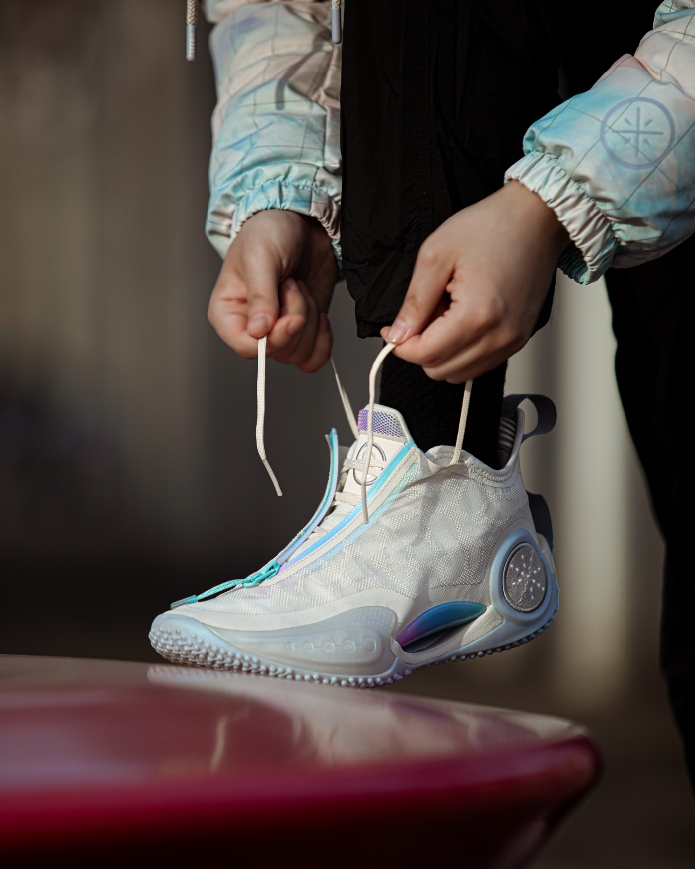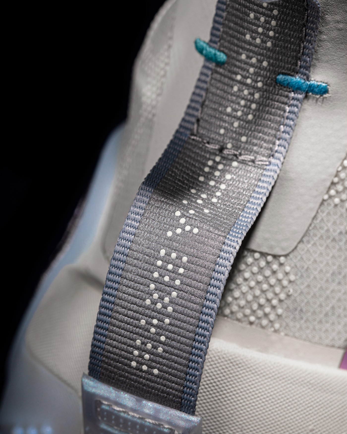 鞋提位置辅以点阵字符及压印文字的鸳鸯设计收尾,增添玩味的个性气质。