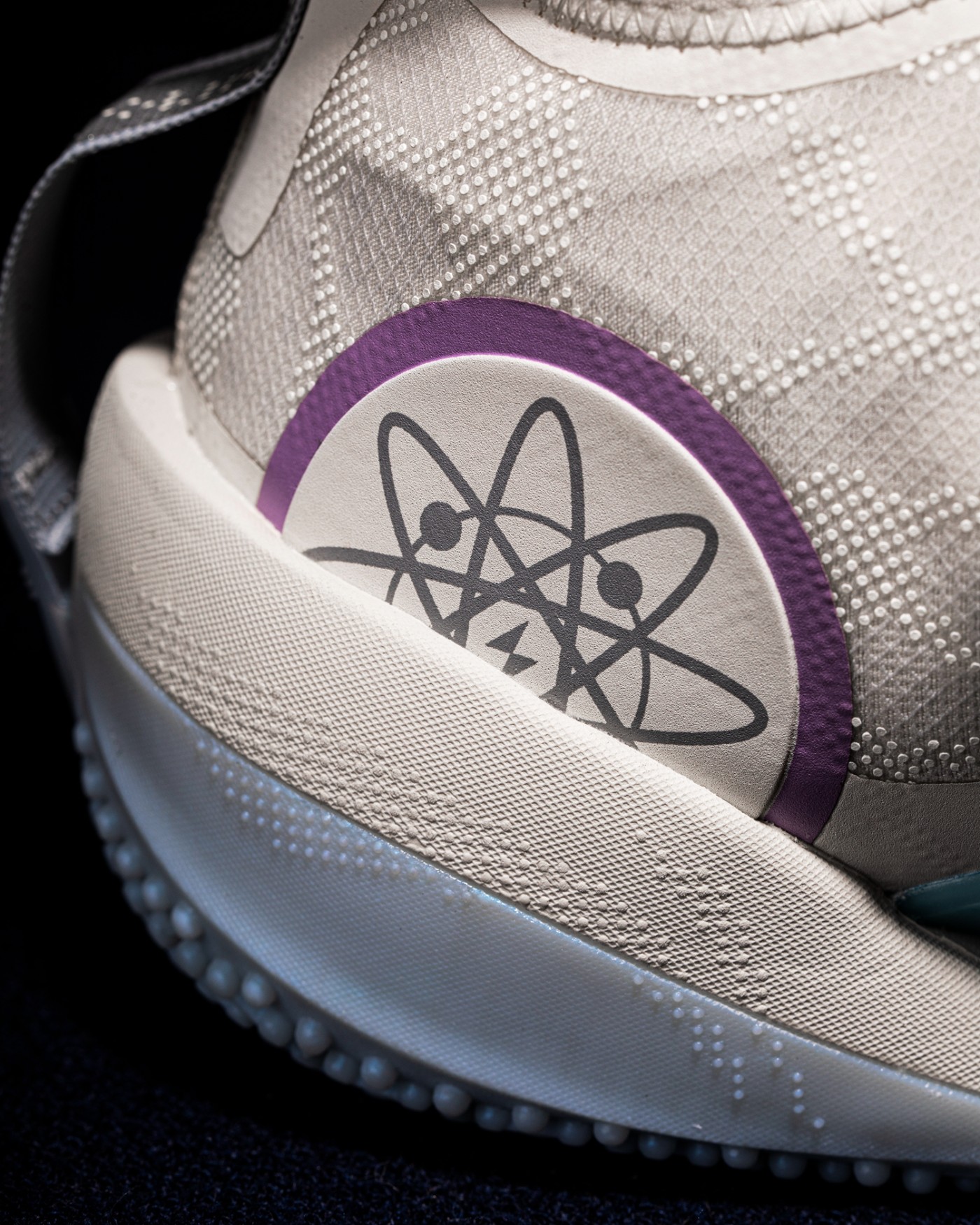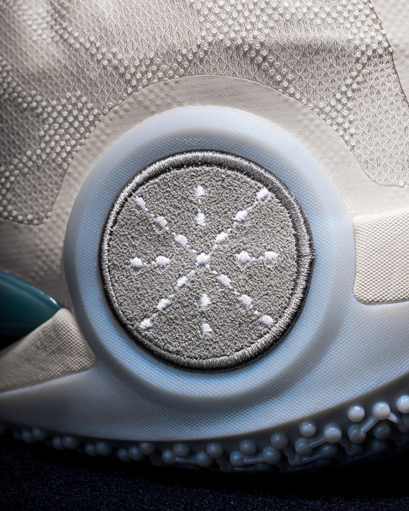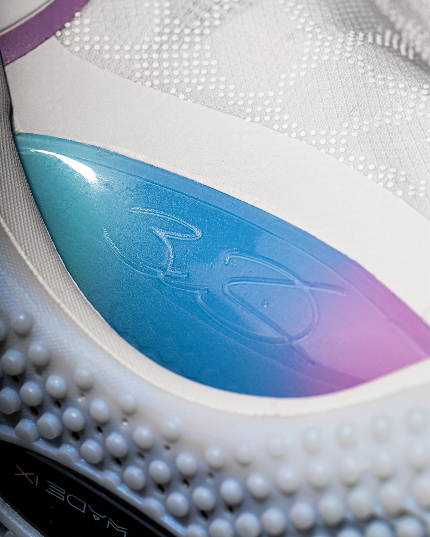 后跟外侧韦德 Logo 则一改碳纤维材质,选用更为细腻的麂皮 + 刺绣呈现,呼应主题。