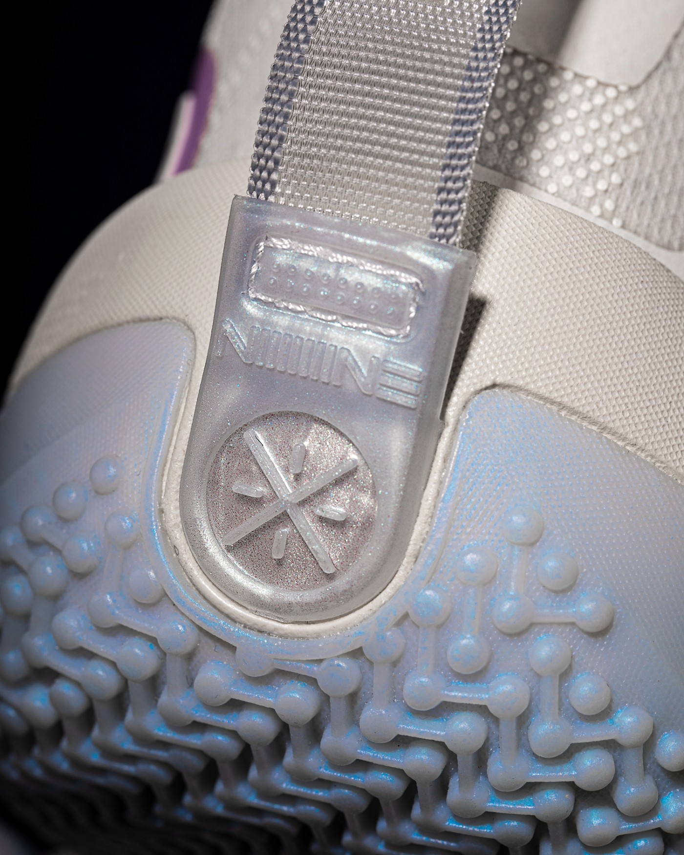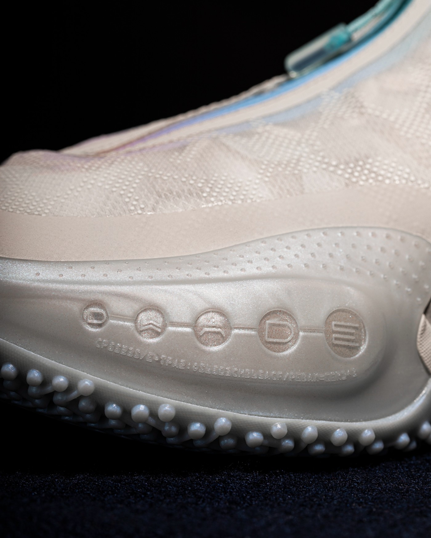 前掌外侧 TPU 及后跟位置,采用珠光质感示人,突出棉花糖的晶莹感觉。